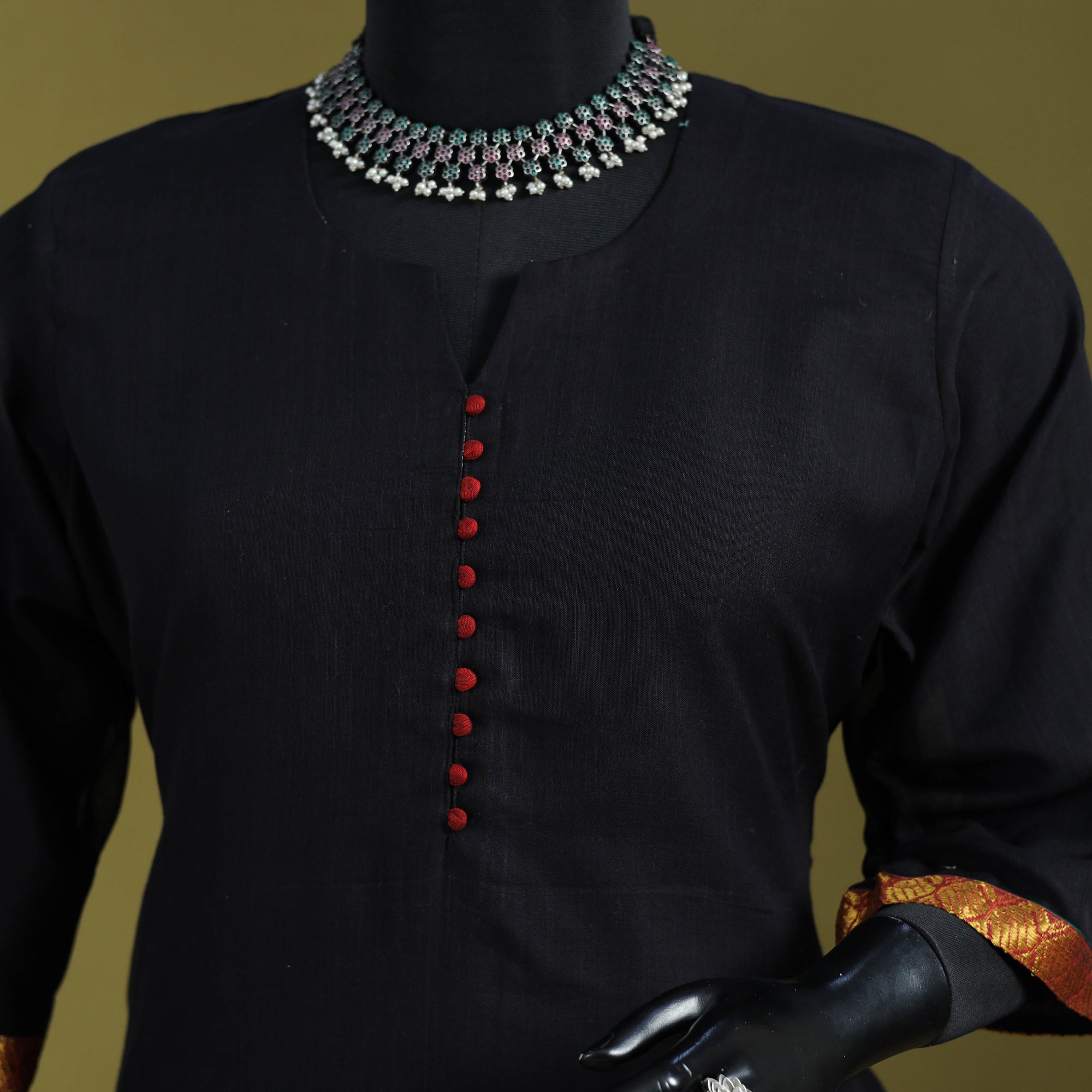 This elegant black dharwad kurta showcases Karnataka’s traditional weaving charm. Designed in a straight-cut silhouette, it features a beautifully woven border on the sleeves and side slits, along with a convenient side pocket for ease. The cotton kurta offers a soft texture and easy comfort, perfect for casual or semi-festive wear. A simple yet graceful outfit that blends culture with everyday style.