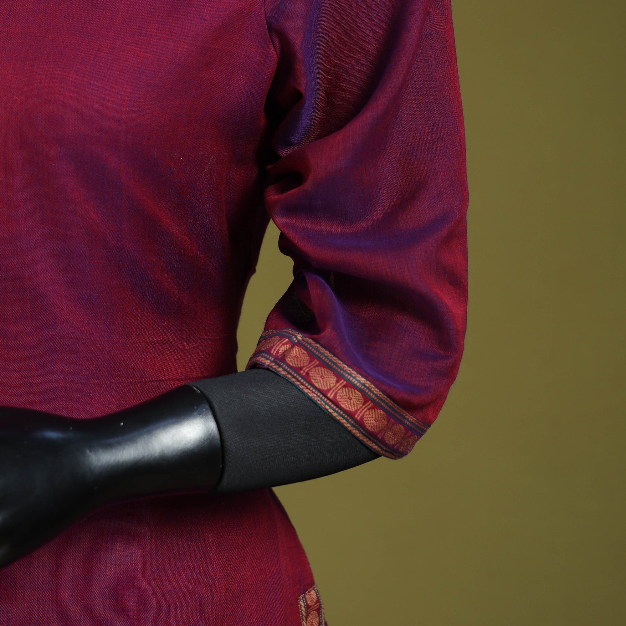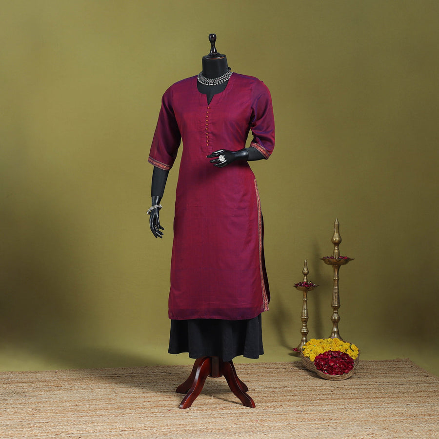 This elegant purple dharwad kurta showcases Karnataka’s traditional weaving charm. Designed in a straight-cut silhouette, it features a beautifully woven border on the sleeves and side slits, along with a convenient side pocket for ease. The cotton kurta offers a soft texture and easy comfort, perfect for casual or semi-festive wear. A simple yet graceful outfit that blends culture with everyday style.