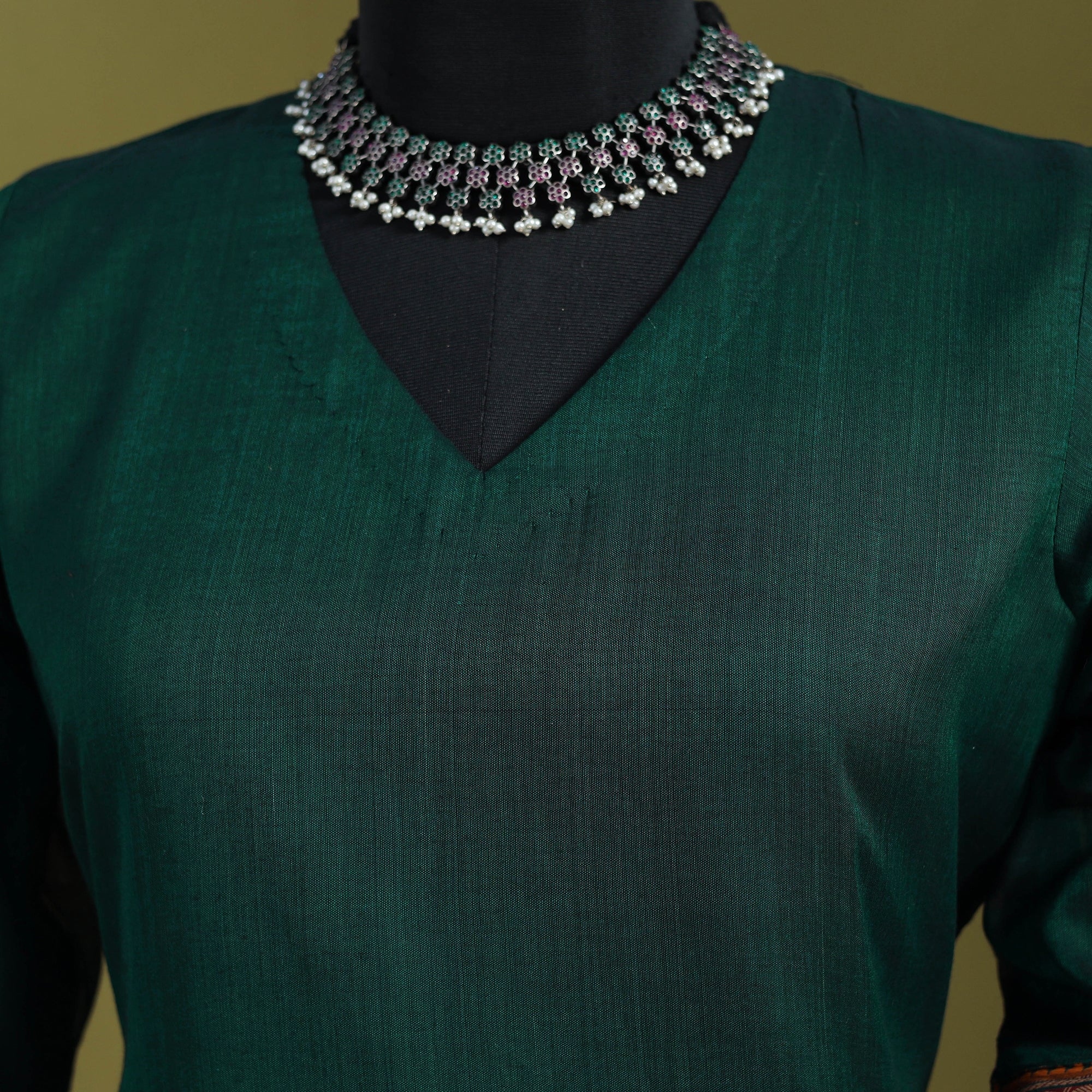 This elegant green dharwad kurta showcases Karnataka’s traditional weaving charm. Designed in a straight-cut silhouette, it features a beautifully woven border on the sleeves and side slits, along with a convenient side pocket for ease. The cotton kurta offers a soft texture and easy comfort, perfect for casual or semi-festive wear. A simple yet graceful outfit that blends culture with everyday style.