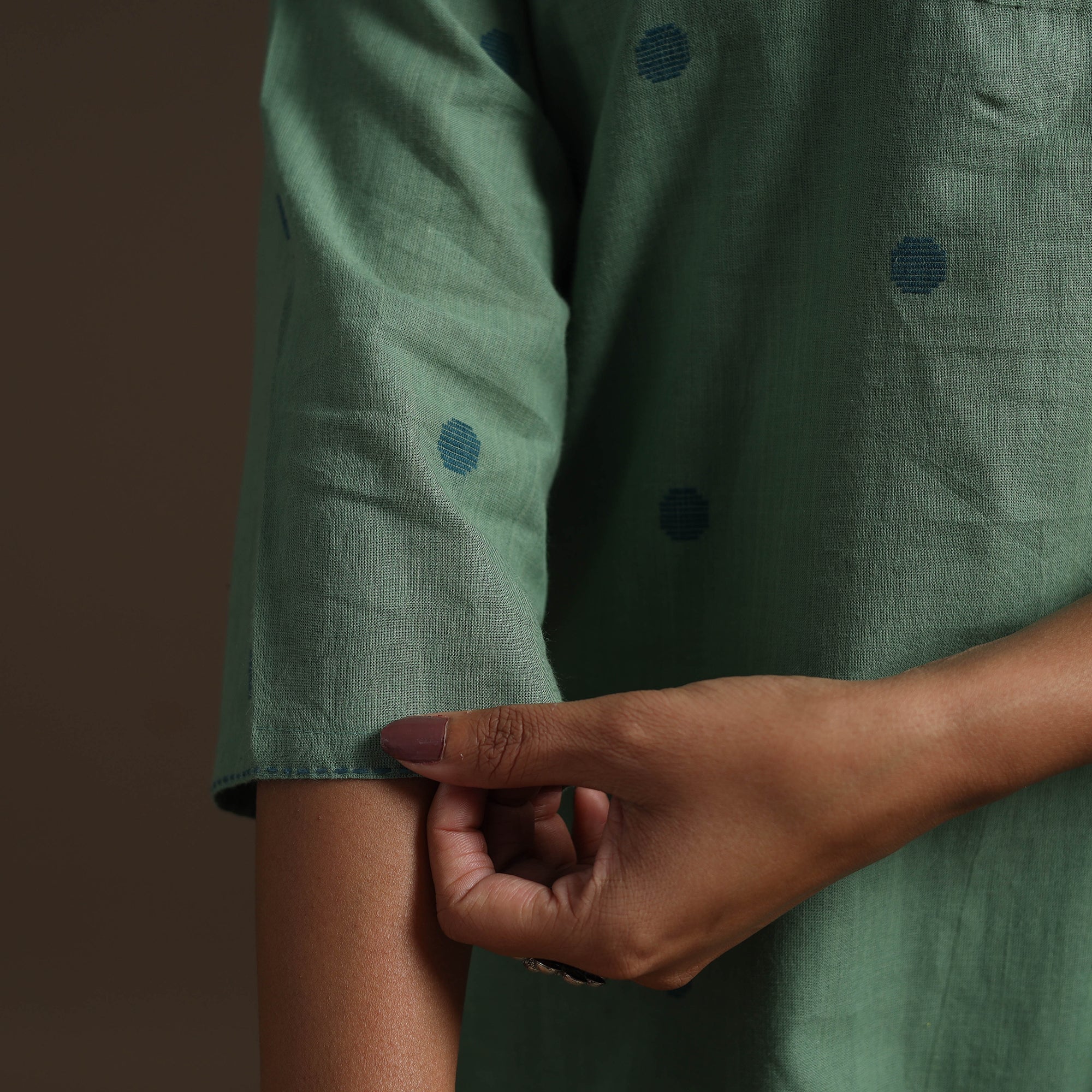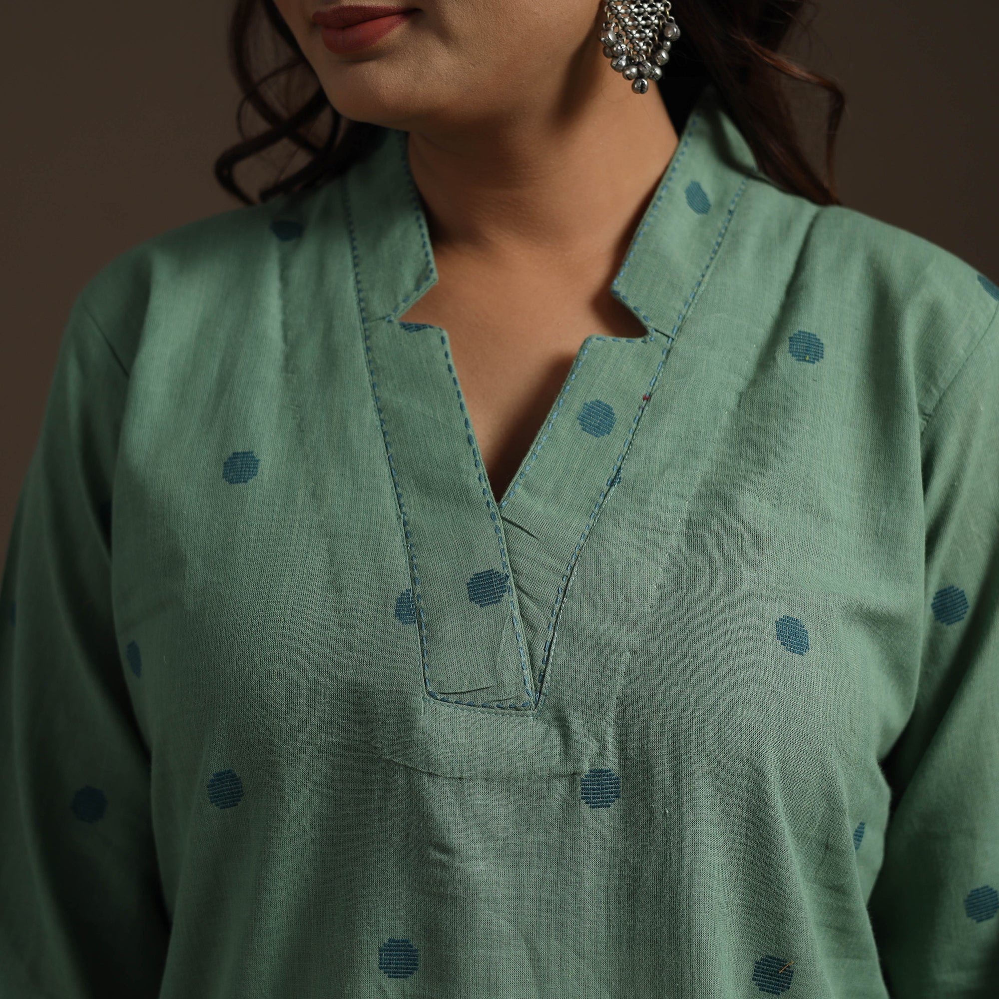 Stay stylish and comfortable in this green straight cotton hand embroidered jacquard kurta. The jacquard weave embeds patterns directly into the fabric, adding a soft texture you can both see and feel. Designed with a convenient side pocket for your essentials, this kurta is perfect for office wear or a relaxed day out.