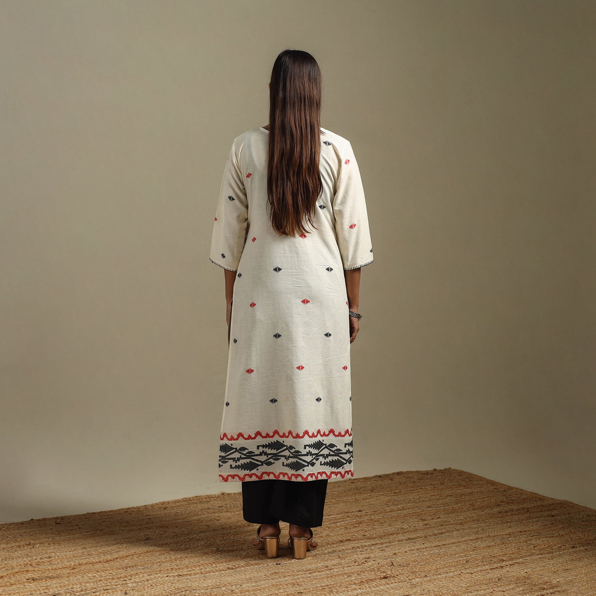 Stay stylish and comfortable in this white straight cotton kurta featuring hand embroidery, a jamdani border and delicate thread buti details. The fabric offers a soft, visible texture, while the practical side pocket keeps everyday essentials within easy reach. Ideal for office wear as well as relaxed day outings.