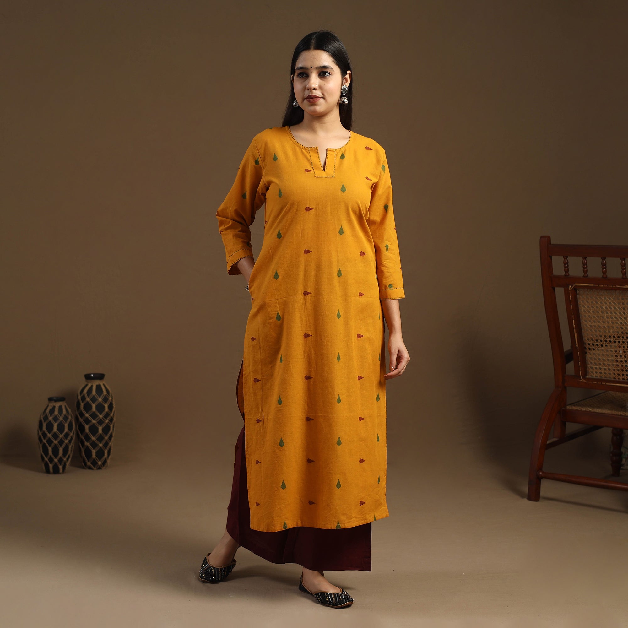 Embrace everyday grace with this yellow straight cotton jacquard kurta, highlighted by its intricate woven artistry. With the added feature of a side pocket, it ensures ease and refinement, making it your go-to outfit for regular days and special celebrations.