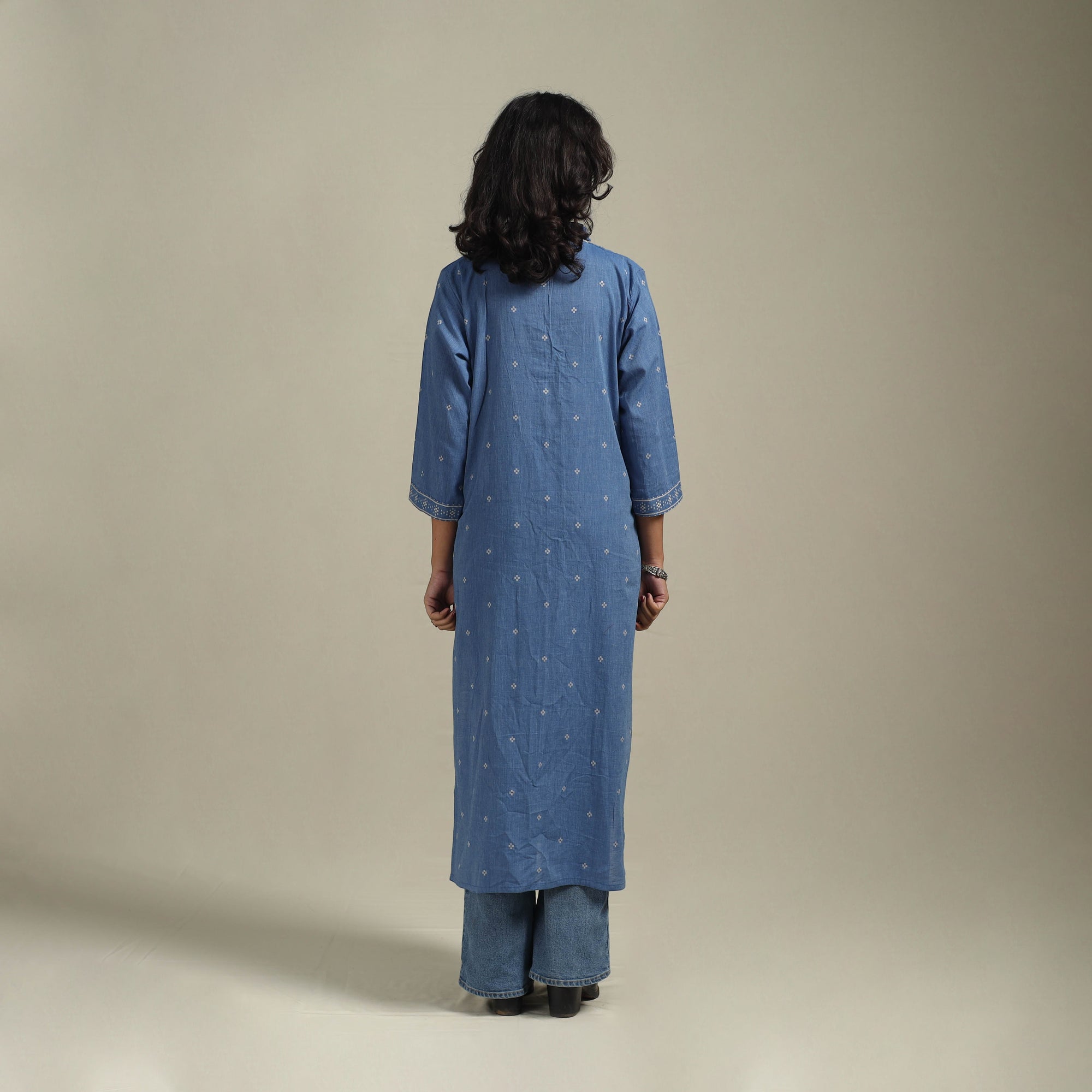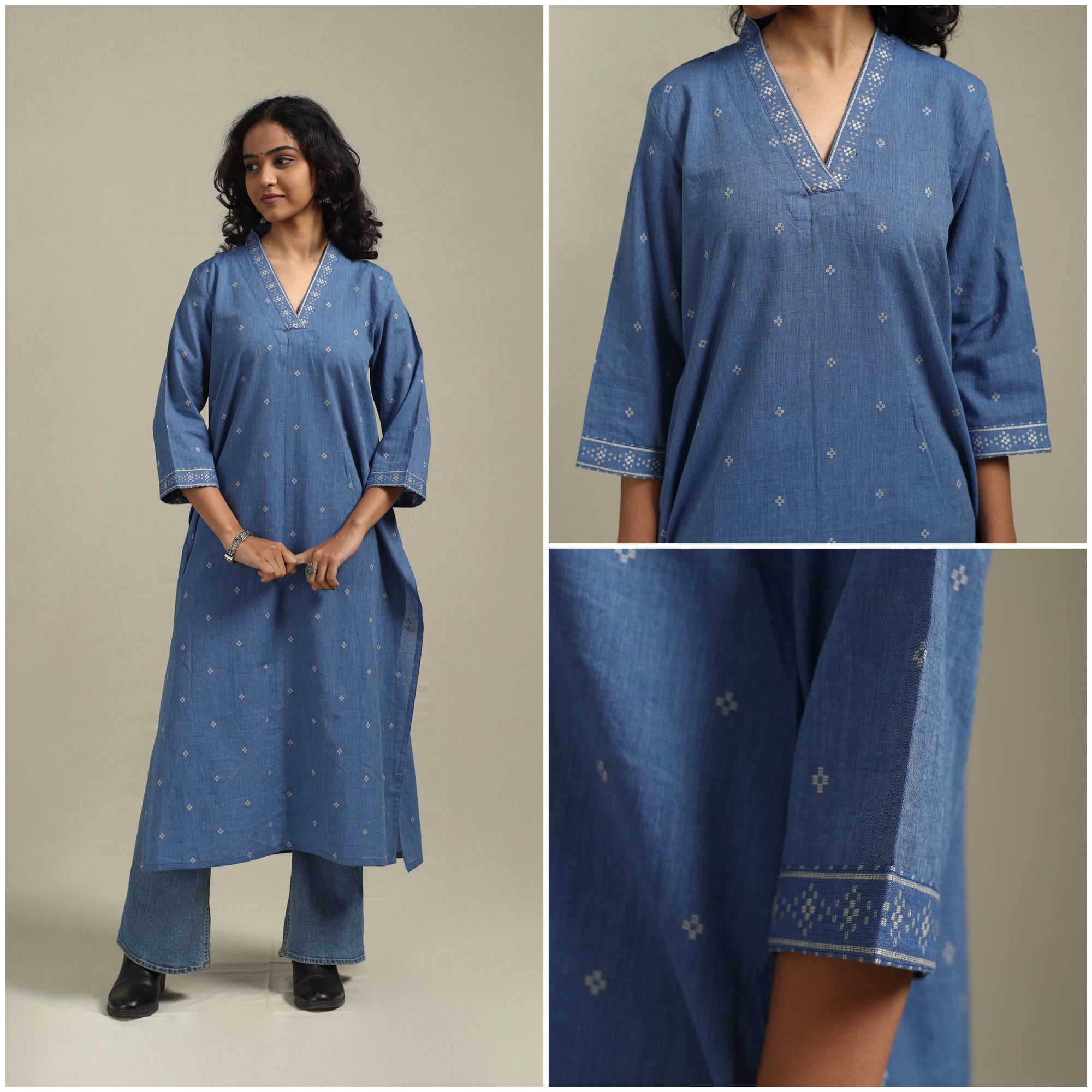 • Blue - straight cotton jacquard kurta 10 - handcrafted