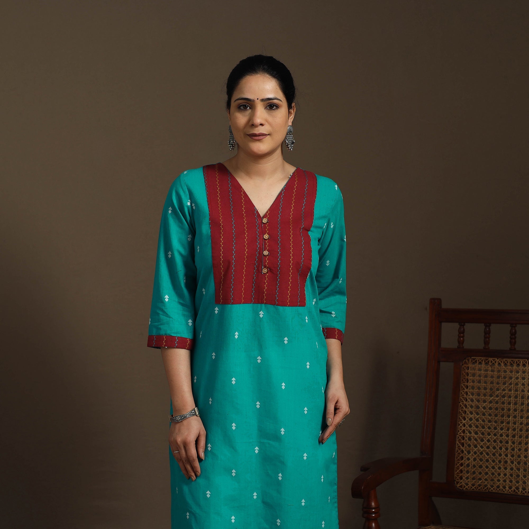 Stay stylish and comfortable in this green straight cotton patchwork jacquard kurta. The jacquard weave embeds patterns directly into the fabric, adding a soft texture you can both see and feel. Designed with a convenient side pocket for your essentials, this kurta is perfect for office wear or a relaxed day out.