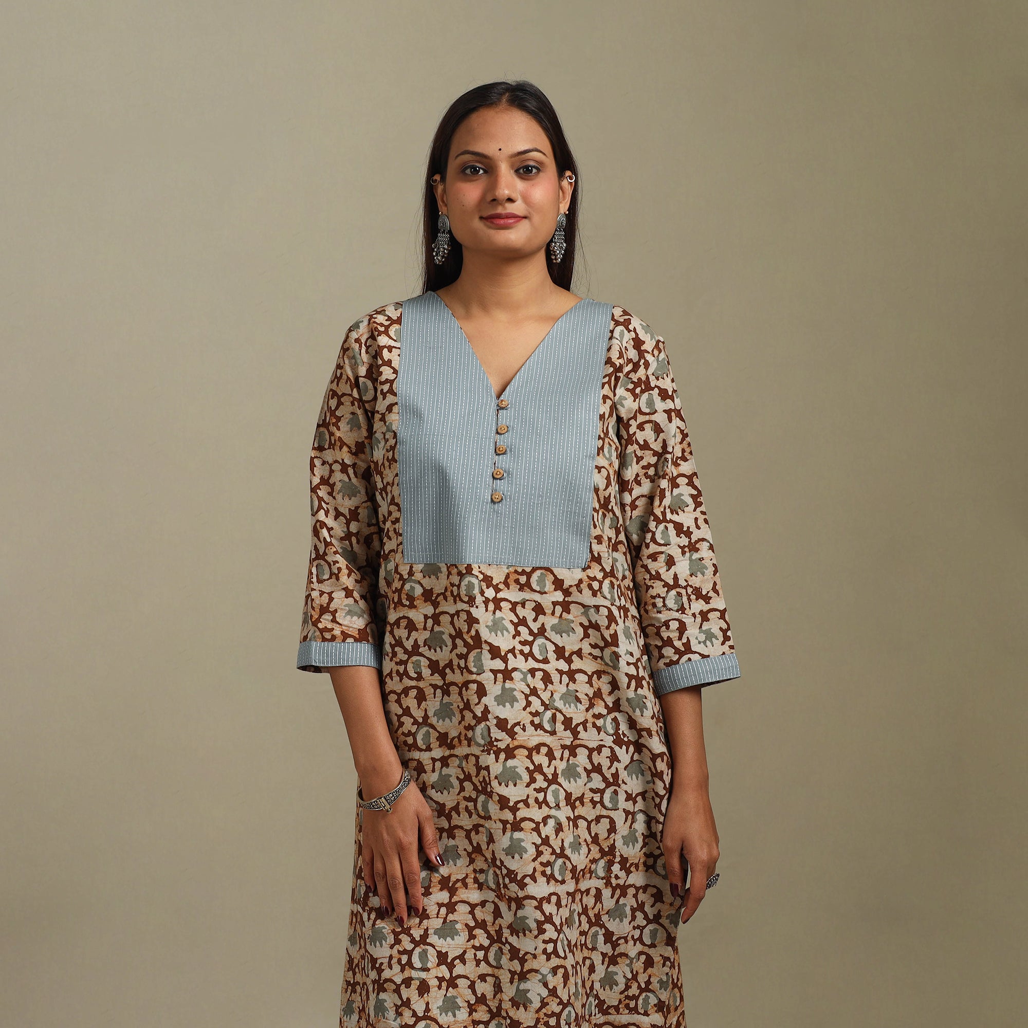 Brown - Straight Patchwork Cotton Hand Block Batik Print Kurta for women 35