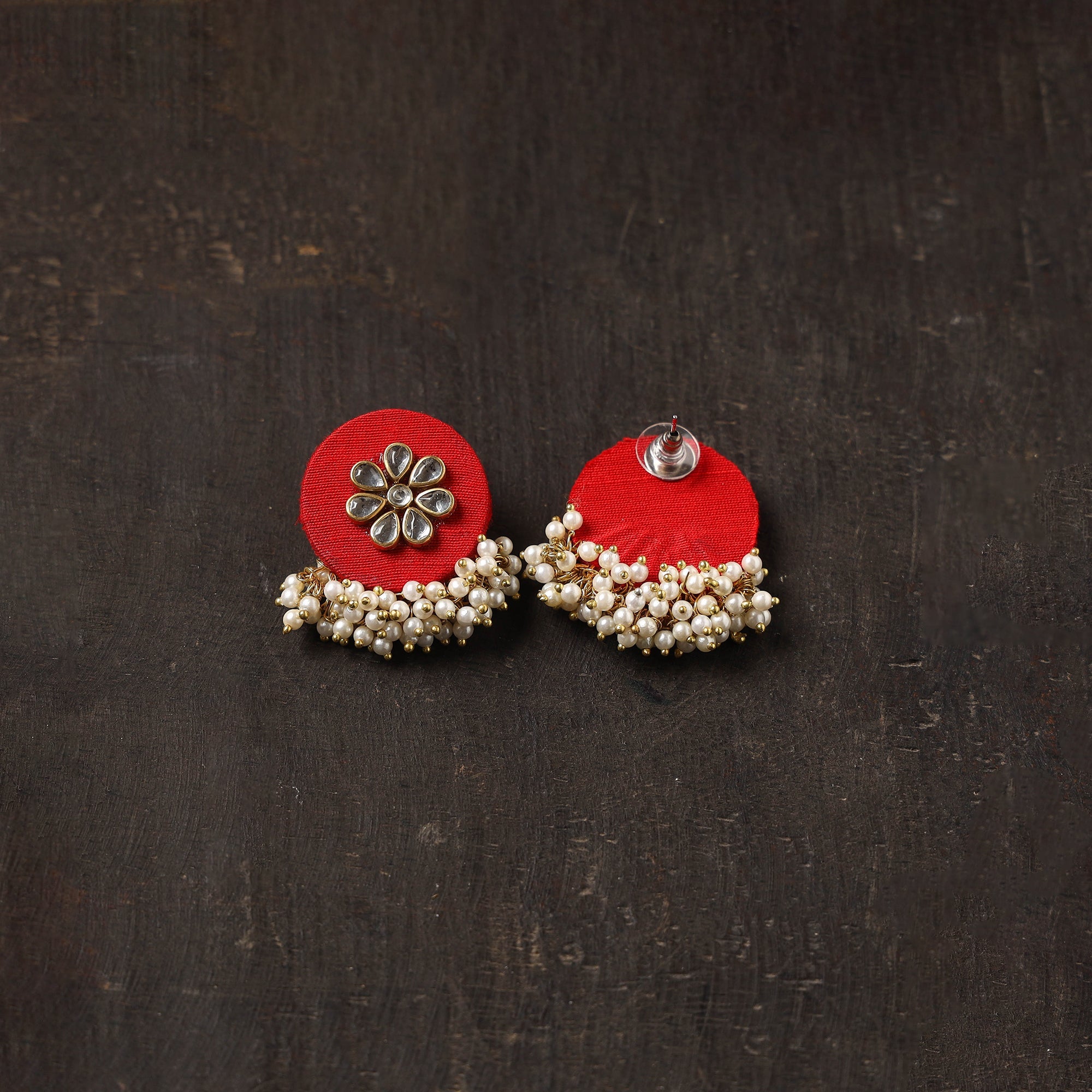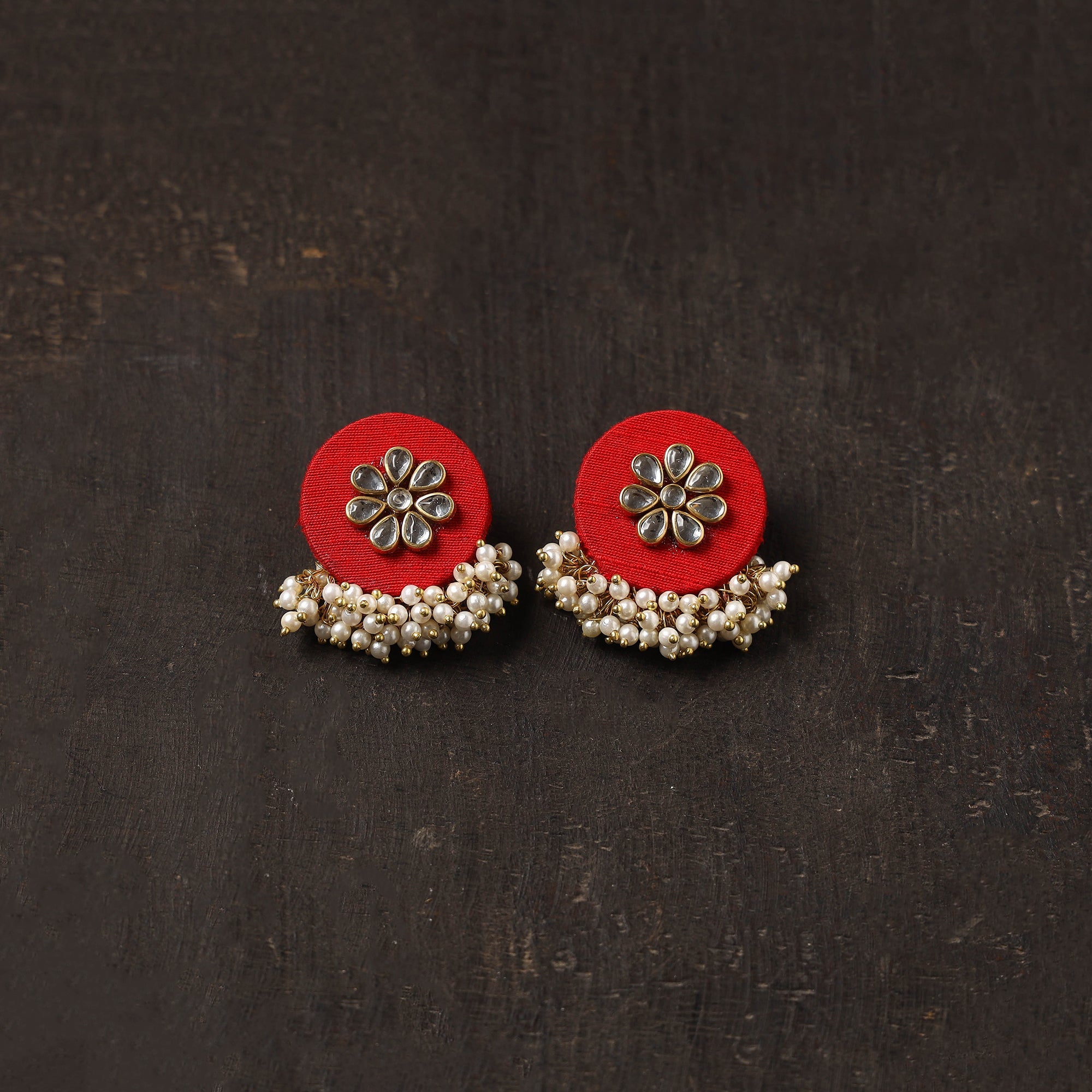 Handcrafted red fabric earrings are beautifully detailed with kundan work and delicate beads. Made by skilled women artisans, they offer a lightweight and perfect for adding a unique charm to festive and everyday looks.