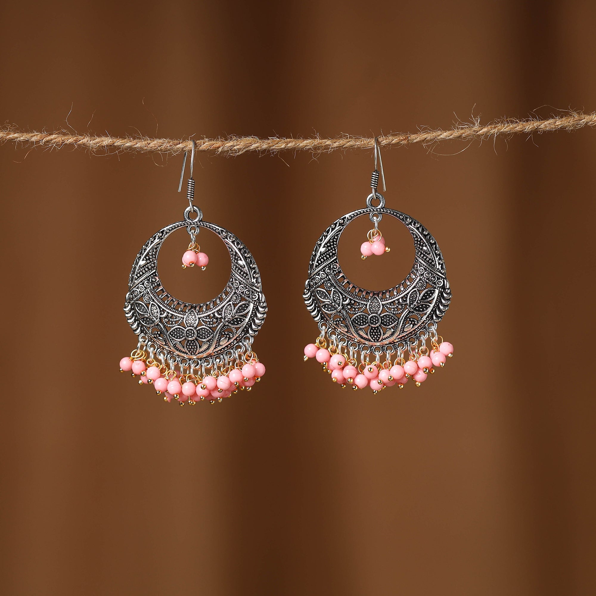 These pink handcrafted earrings are made from oxidised german silver and embellished with intricate beadwork. Known for its durability and antique-like finish, german silver gives these earrings a distinctive, elegant look. Ideal for festive occasions, casual outings, or elevating your daily ensemble with a subtle artisanal flair.