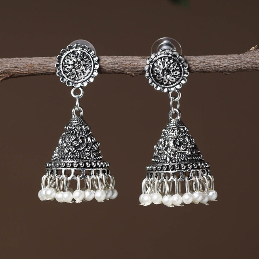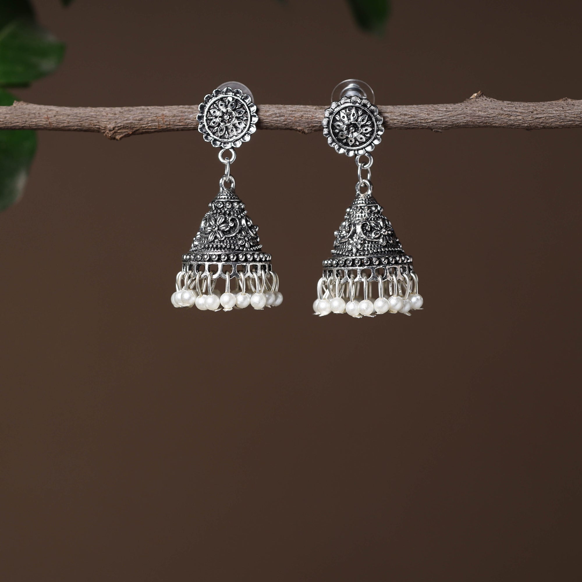 Enhance the gracefulness of your attire with our grey handcrafted german silver jhumki bead work earrings, beautifully blend traditional design with modern elegance. German Silver pattern adorned with subtle beads, culminating in charming jhumkas. You can wear this with casual or festive dresses.