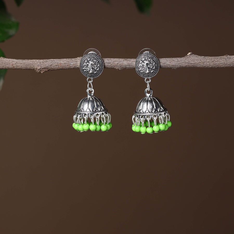 Enhance the gracefulness of your attire with our grey handcrafted german silver jhumki bead work earrings, beautifully blend traditional design with modern elegance. German silver pattern adorned with subtle beads, culminating in charming jhumkas. You can wear this with casual or festive dresses.