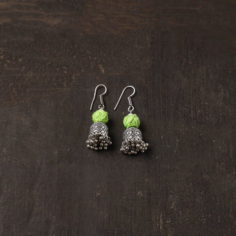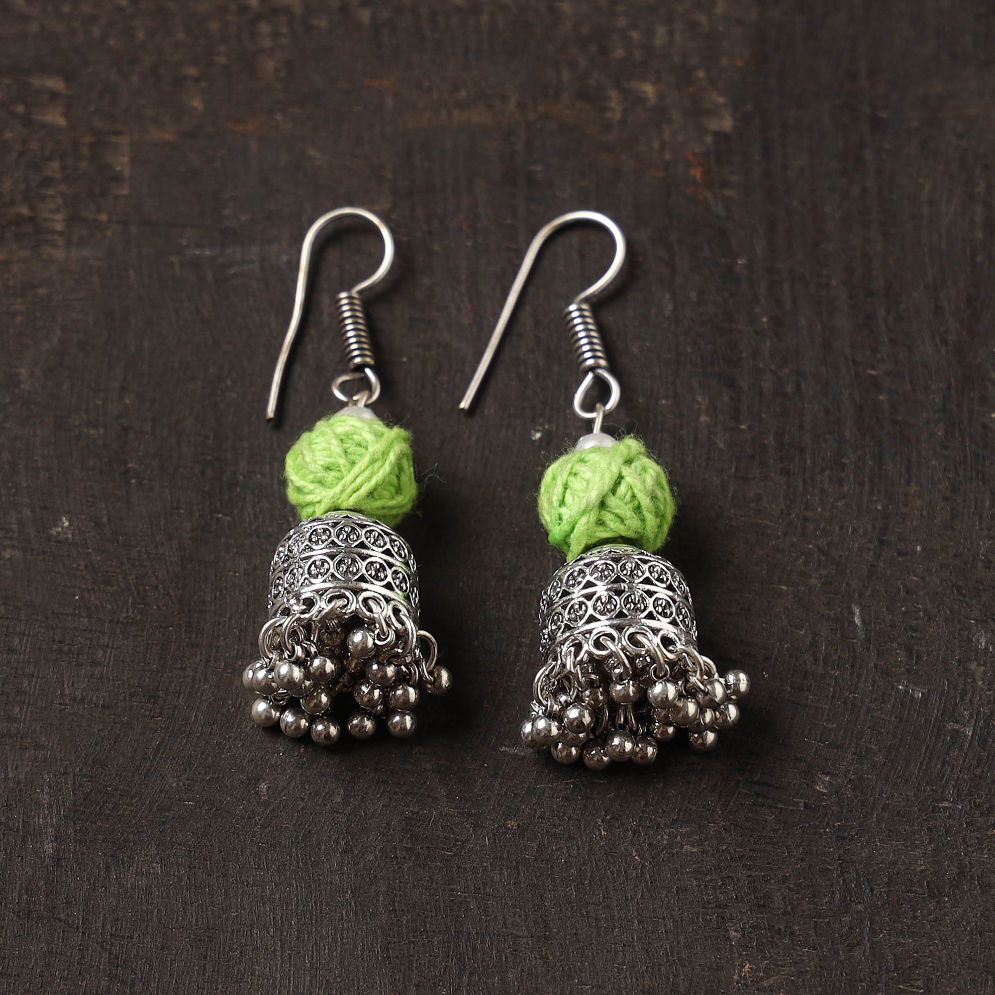 Handcrafted german silver jhumki earrings are beautifully detailed with green thread beads. Made by iskilled artisans, they offer a lightweight, and perfect for adding a unique charm to festive and everyday looks. German silver adds durability and is known for its strong, long-lasting finish.