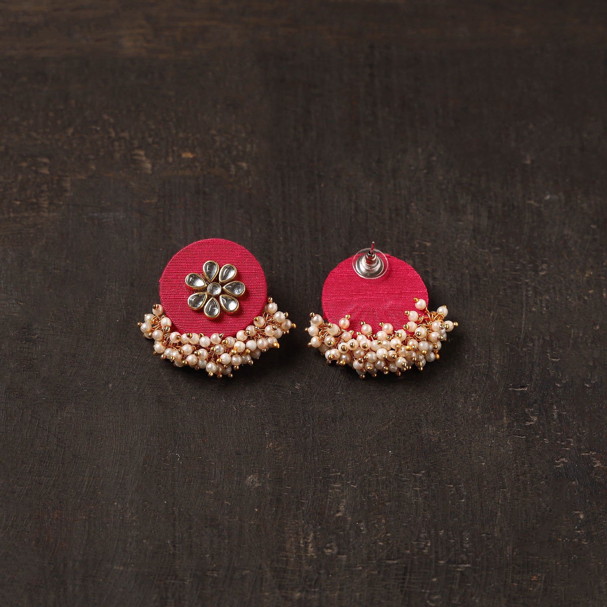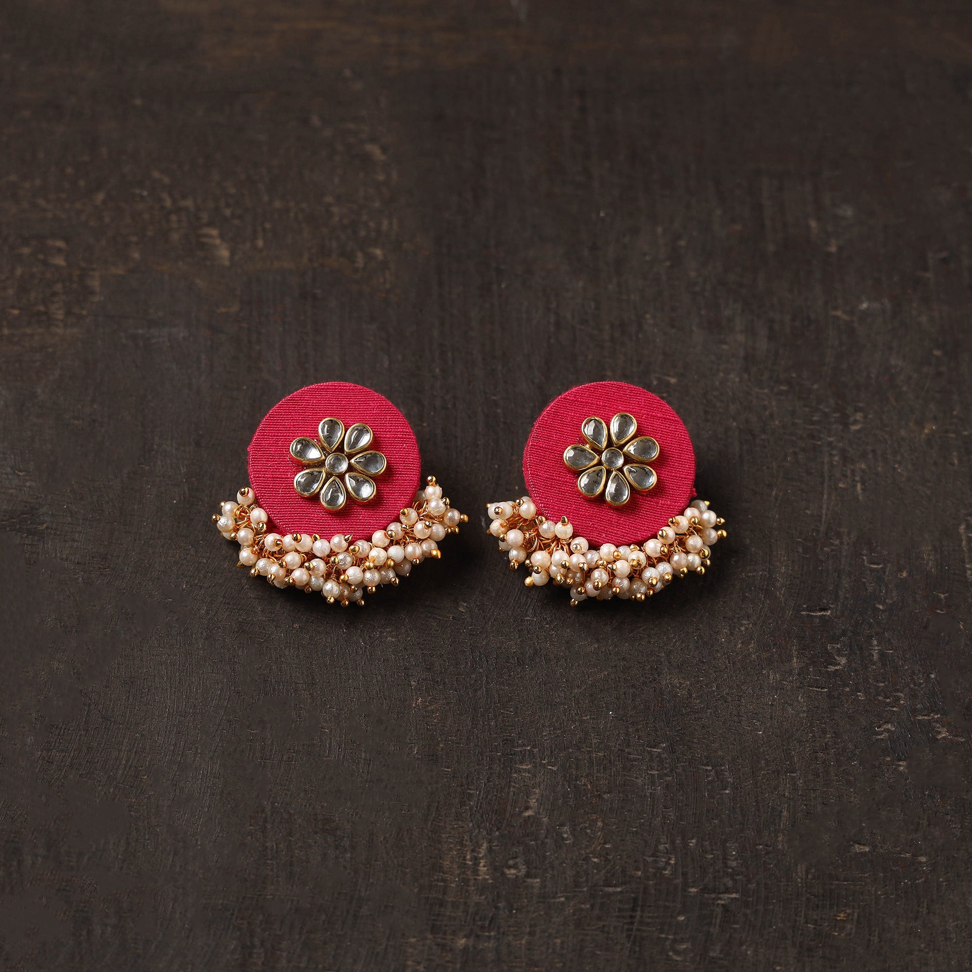 Handcrafted red fabric earrings are beautifully detailed with kundan work and delicate beads. Made by skilled women artisans, they offer a lightweight and perfect for adding a unique charm to festive and everyday looks.
