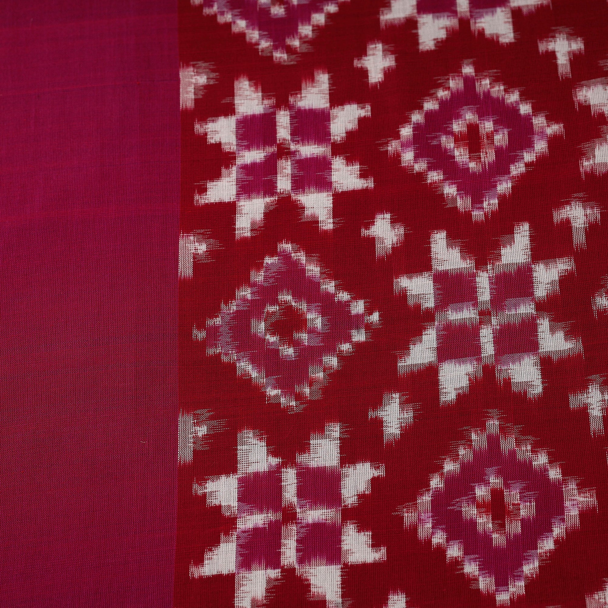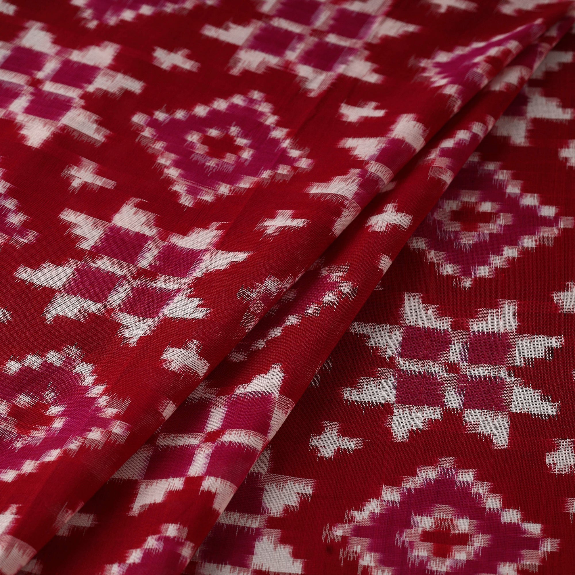 This red telia rumal handloom cotton double ikat fabric from Telangana is a rare and special weave of India. It is created using an age-old technique where both the warp and weft threads are dyed before weaving, forming precise geometric designs. The fabric is celebrated for its bold red, black, and white patterns, along with traditional oil-treated yarns that add strength and character. Once valued by traders and royals, telia rumal is today admired for making garments, dupattas, and distinctive home decor pieces.