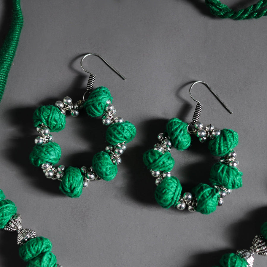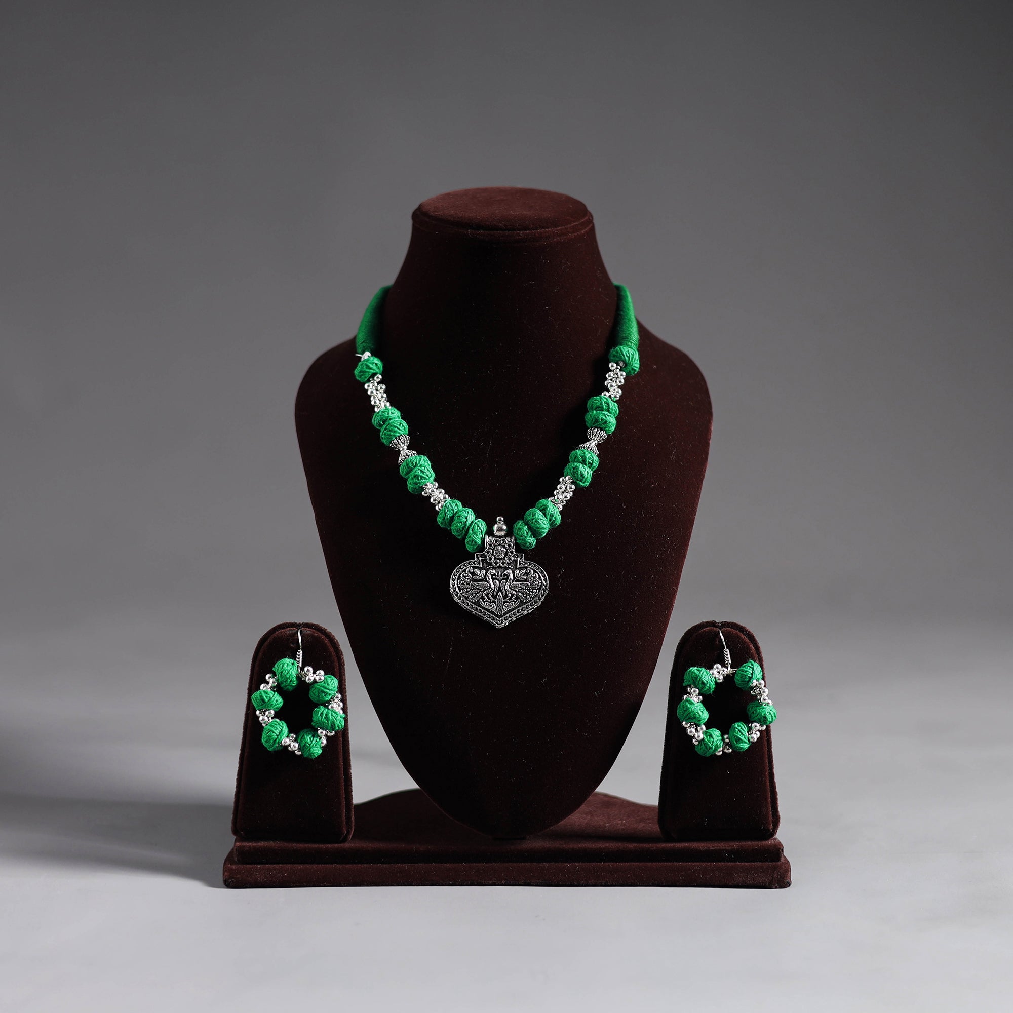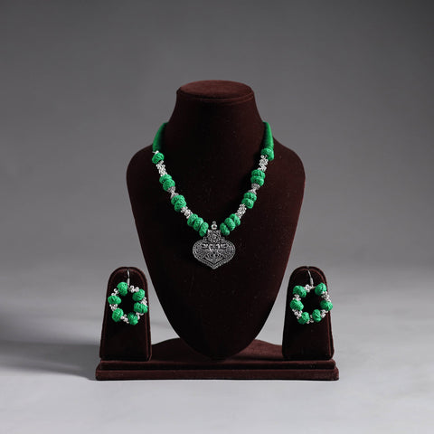 Green thread beads handmade german silver necklace set. This piece features intricate thread beads paired with durable german silver, known for its shiny finish. Perfect for any occasion, it adds a touch of traditional charm to your ensemble, elevating your style effortlessly. This Handmade necklace set consists a pair of earrings.