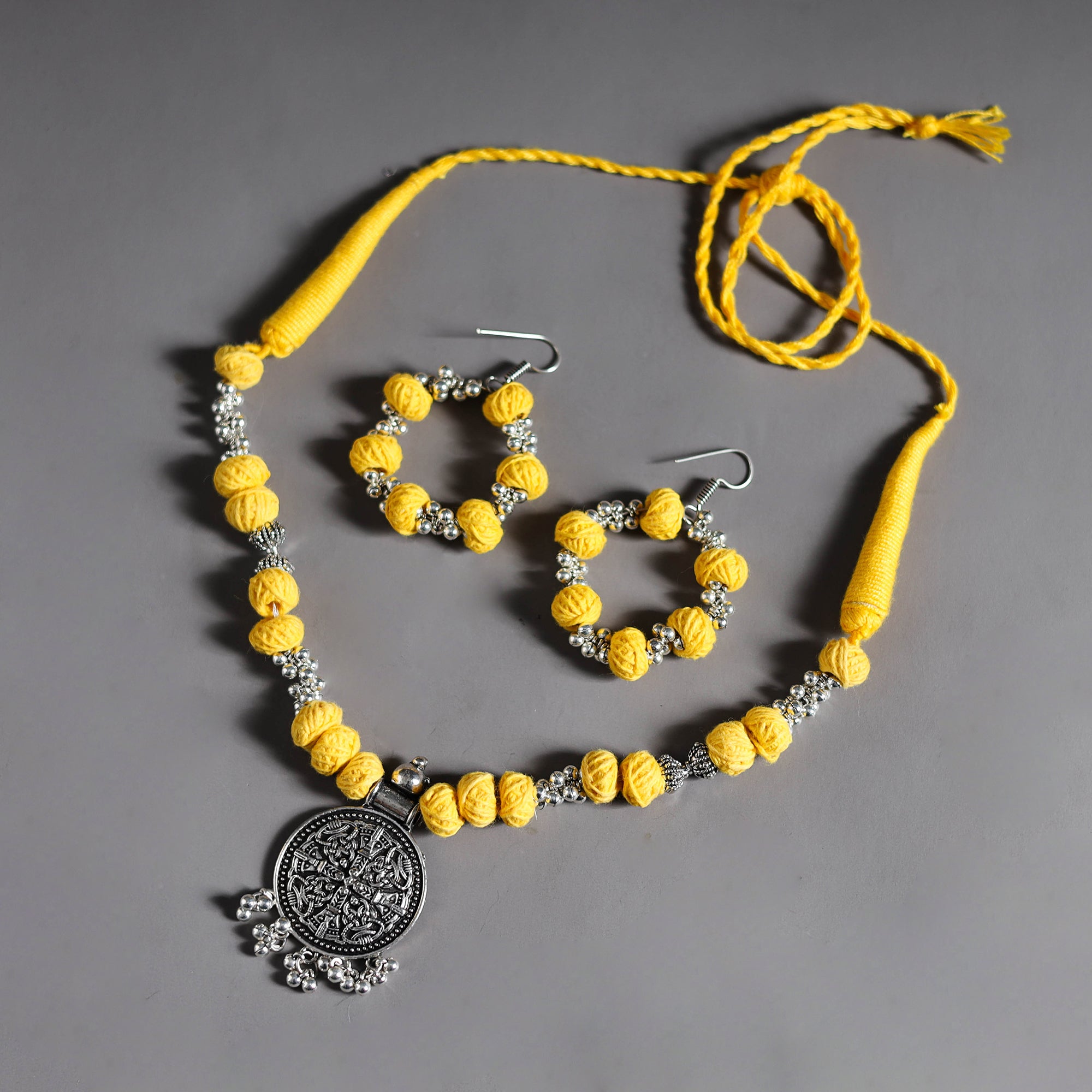 Yellow thread beads handmade german silver necklace set. This piece features intricate thread beads paired with durable german silver, known for its shiny finish. Perfect for any occasion, it adds a touch of traditional charm to your ensemble, elevating your style effortlessly. This Handmade necklace set consists a pair of earrings.