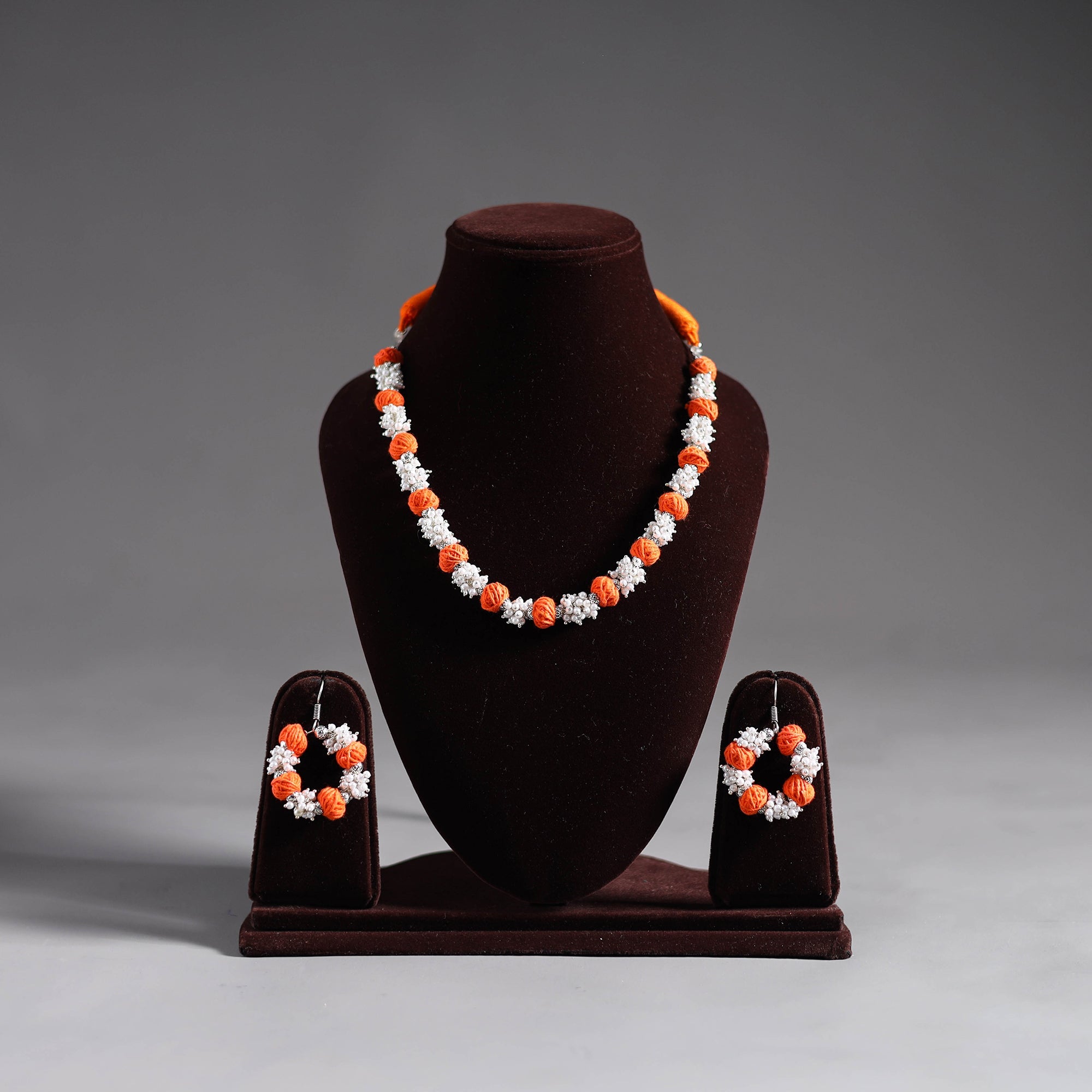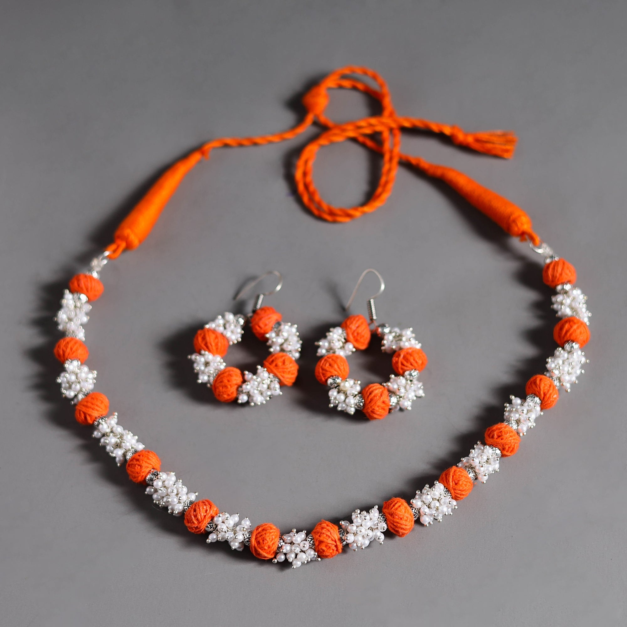 Orange Thread Beads Handmade Necklace Set. This Handmade necklace set consists a pair of earrings. Perfect for any occasion, it adds a touch of traditional charm to your ensemble, elevating your style effortlessly.