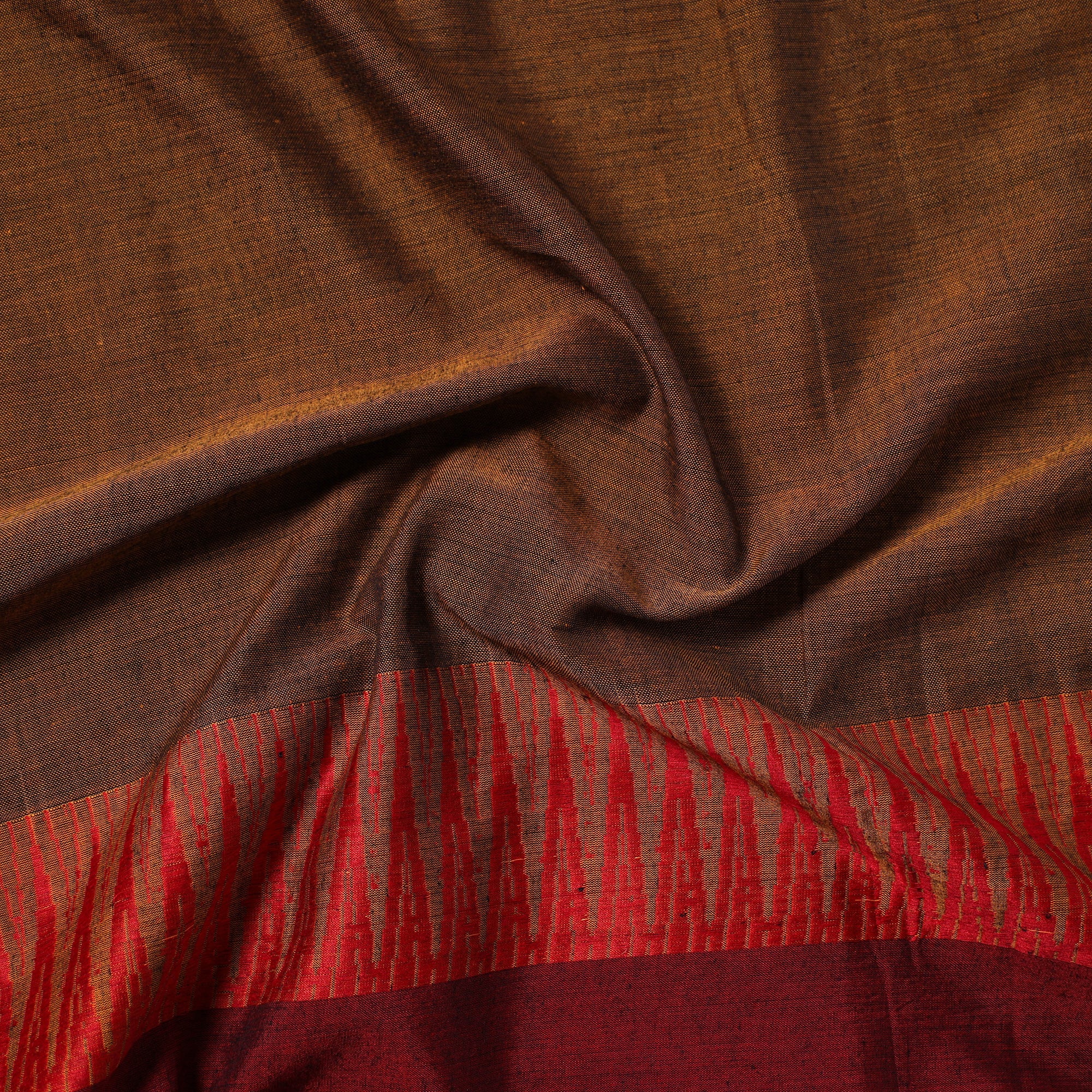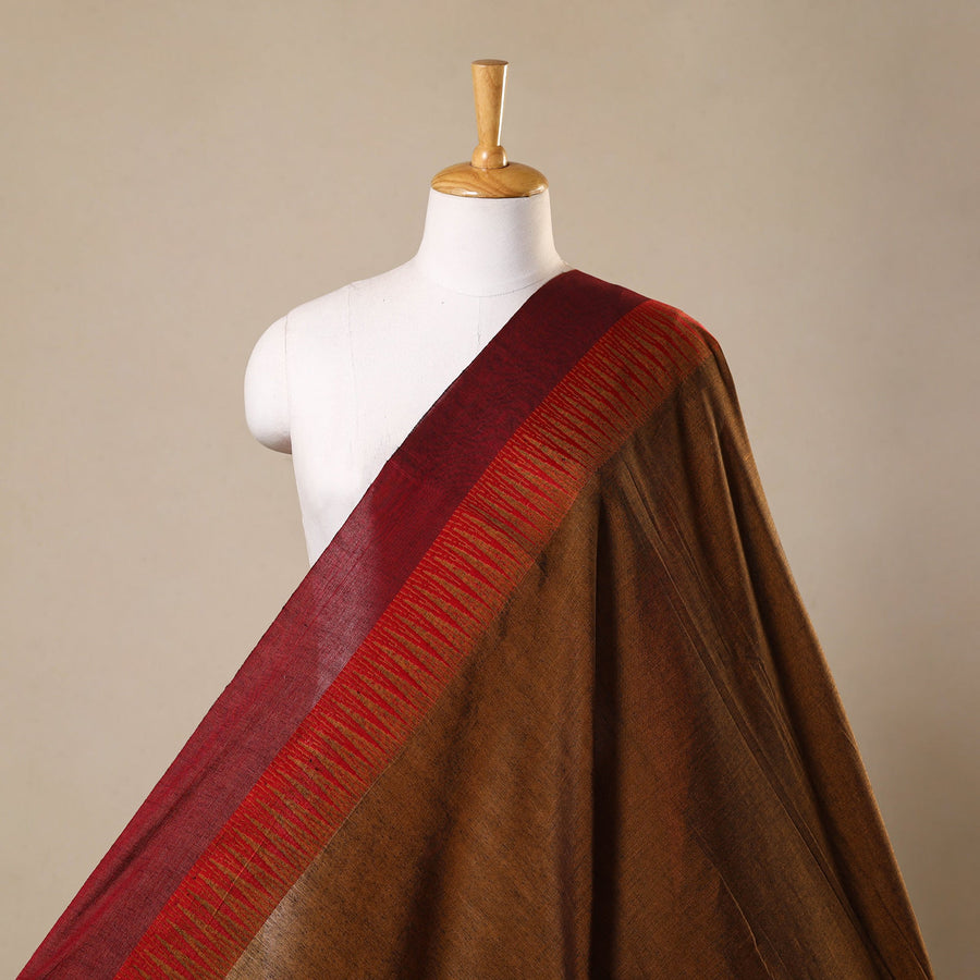 Brown dharwad cotton fabric with a traditional thread-woven border from Dharwad, Karnataka. This is a machine-made fabric with no handmade process involved. Perfect for a range of attire, home decor, and craft projects, it adds a touch of heritage to your creations.