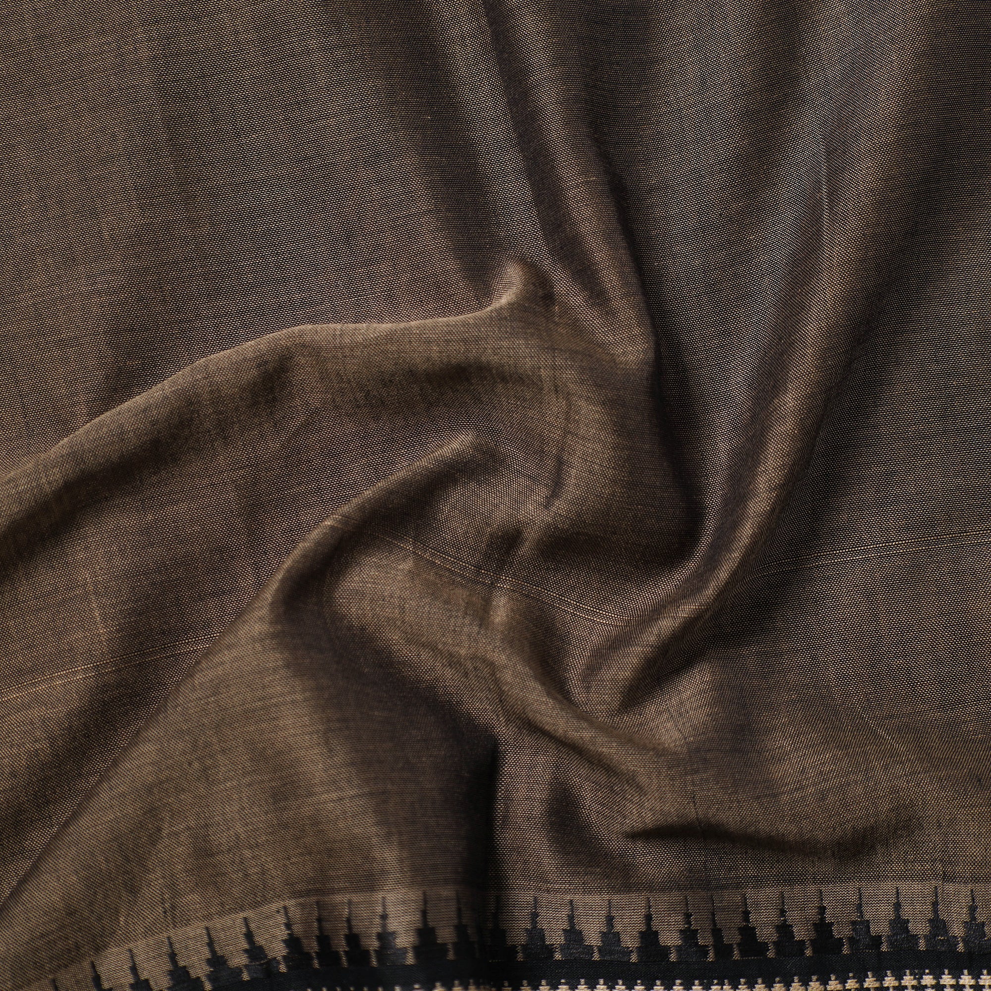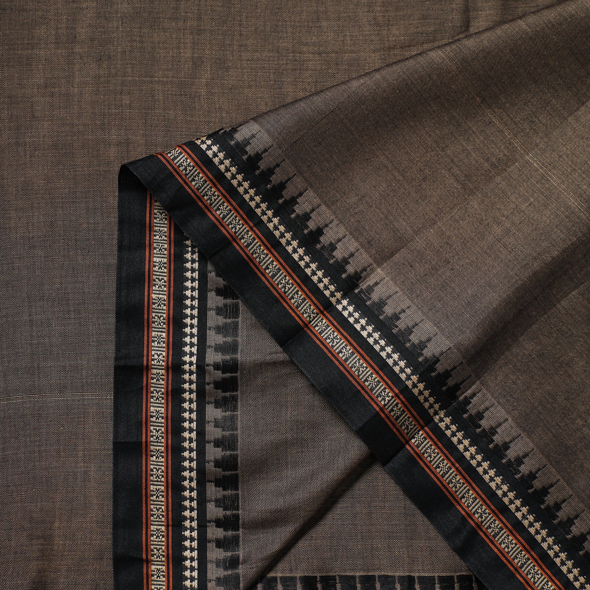 Brown dharwad cotton fabric with a traditional thread-woven border from Dharwad, Karnataka. This is a machine-made fabric with no handmade process involved. Perfect for a range of attire, home decor, and craft projects, it adds a touch of heritage to your creations.