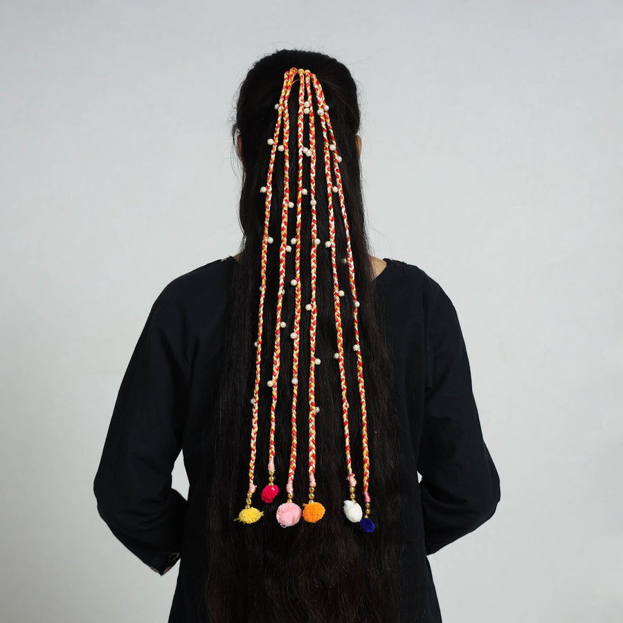 Handcrafted thread braided hair strings made by the artisans. Crafted with love using vibrant threads and adorned with intricate details. Ideal for women and girls who love to incorporate traditional into their look.