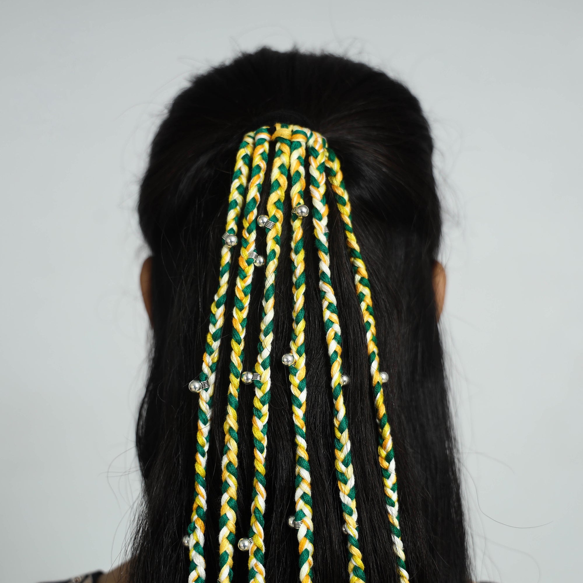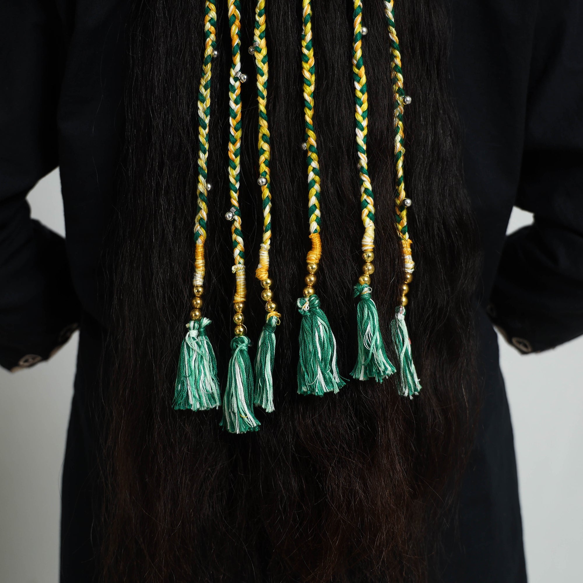 Handcrafted thread braided hair strings made by the artisans. Crafted with love using vibrant threads and adorned with intricate details. Ideal for women and girls who love to incorporate traditional into their look.