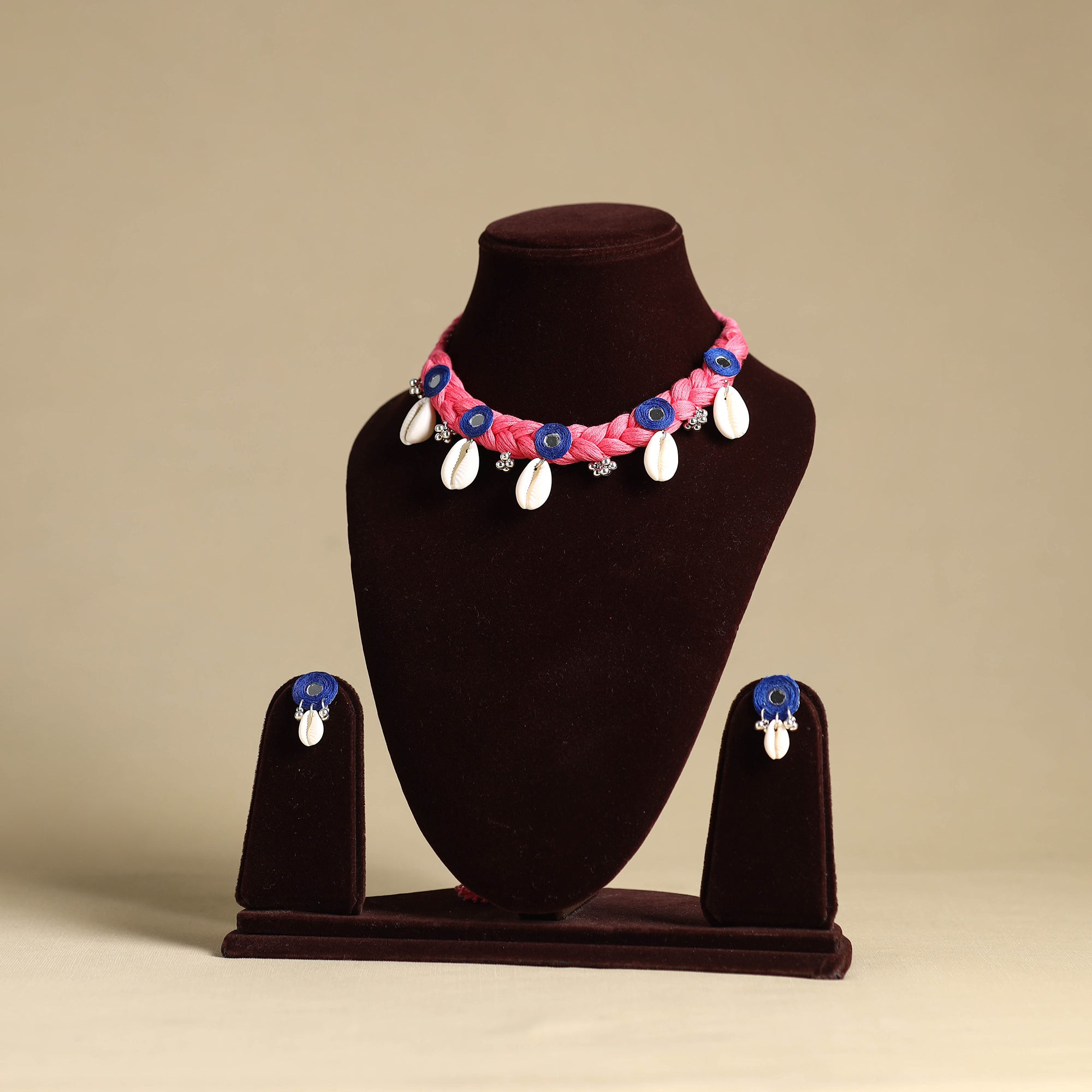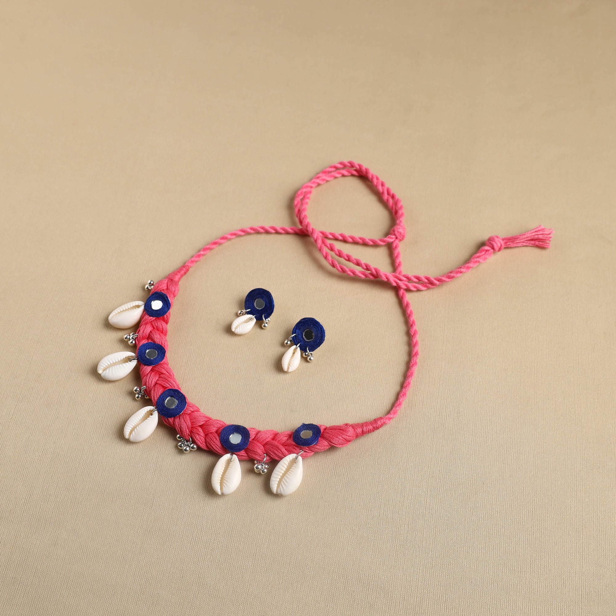 Add a touch of handmade charm with this thread-braided pink choker necklace set, embellished with shells and mirror accents. Crafted by skilled artisans, it’s lightweight and pairs seamlessly with traditional outfits. A lovely pick for festive events, family functions, or to add a graceful twist to your everyday style.