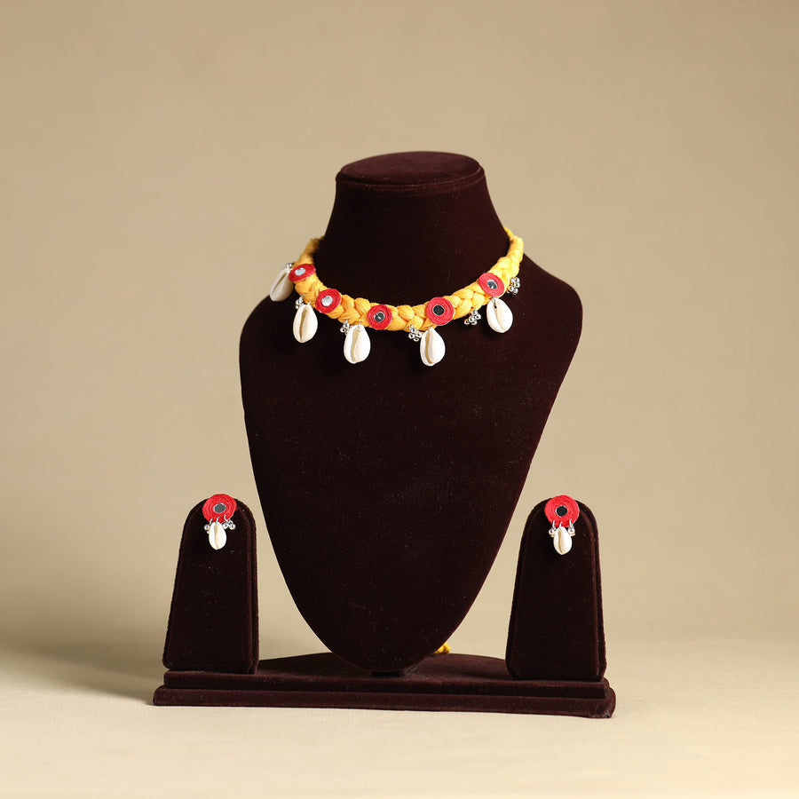Add a touch of handmade charm with this yellow thread-braided choker necklace set, embellished with shells and mirror accents. Crafted by skilled artisans, it’s lightweight and pairs seamlessly with traditional outfits. A lovely pick for festive events, family functions, or to add a graceful twist to your everyday style.