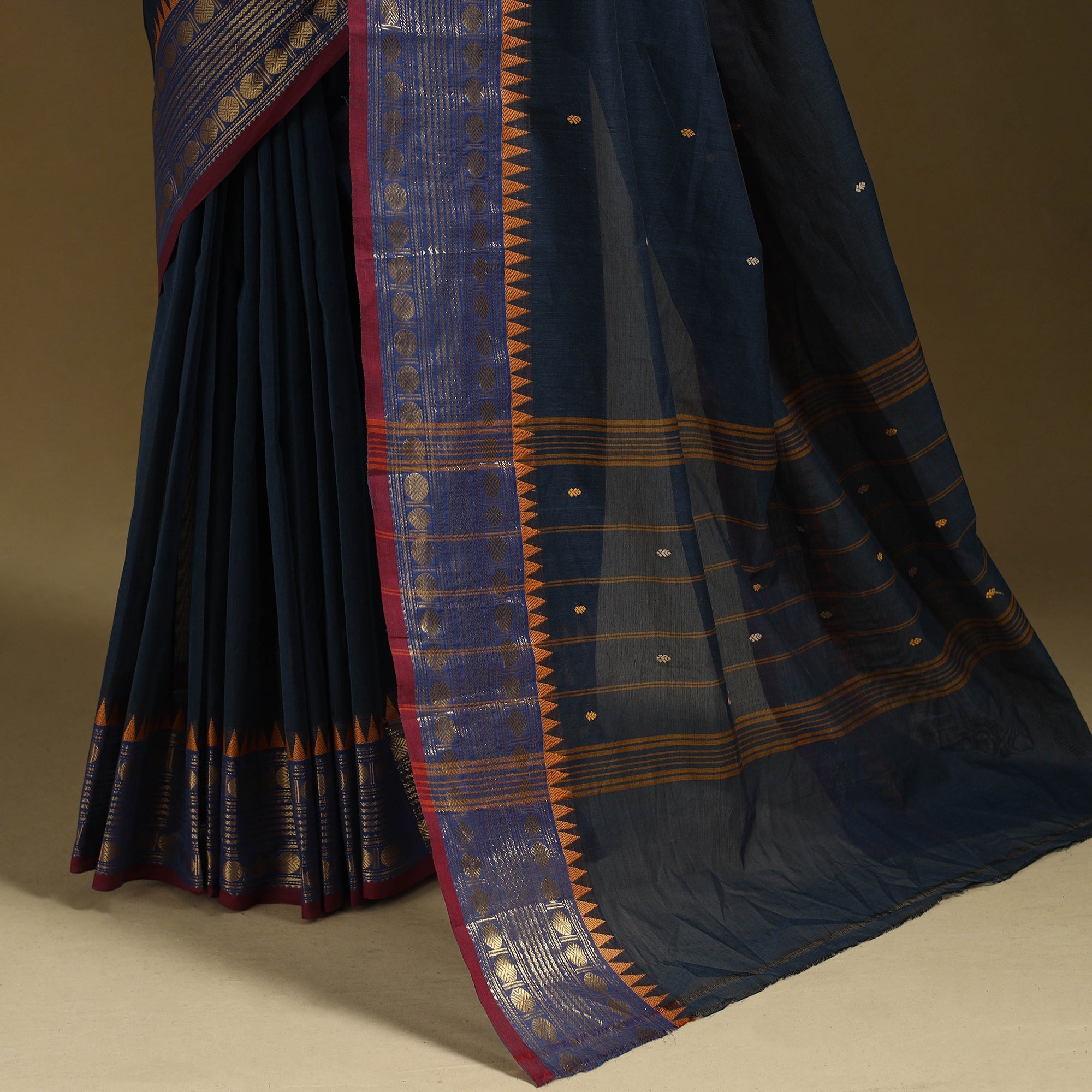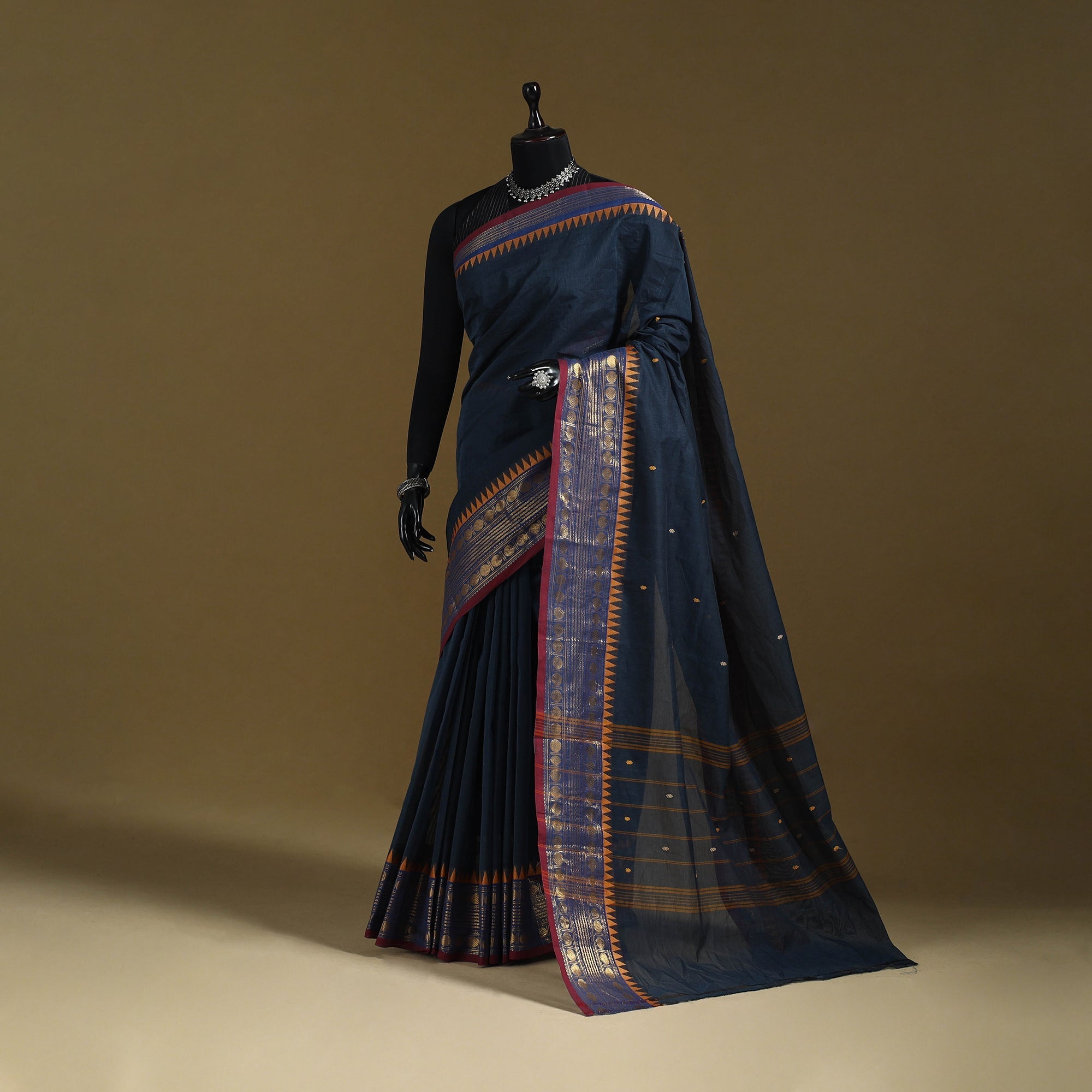 | Material | Black kanchipuram cotton saree from Tamil Nadu, a city widely known as the Temple City of India. Also called a Kanjeevaram saree, it features thread buti designs on the body and is especially known for its woven border work, which adds a refined touch to the overall look. Comfortable and easy to carry, it works well for regular wear, workdays, special occasions and wedding functions. Note: This piece carries tiny knots, thread pulls or uneven lines not flaws but fingerprints. Every irregularity is a whisper from the hands that made it. It’s what happens when tradition weaves through time not machines. If you’re looking for perfection, this isn’t it. But if you’re looking for soul you’ve found it. |