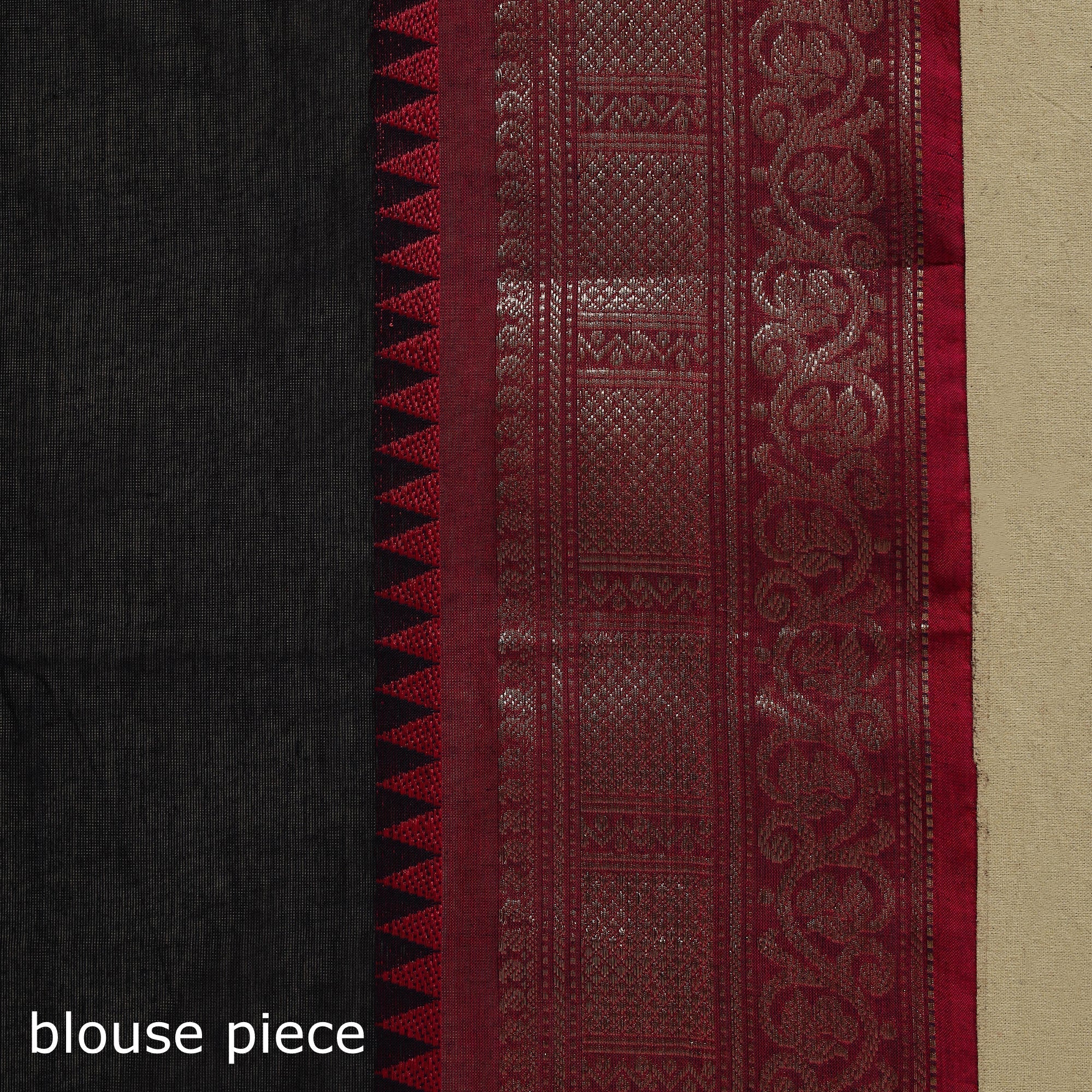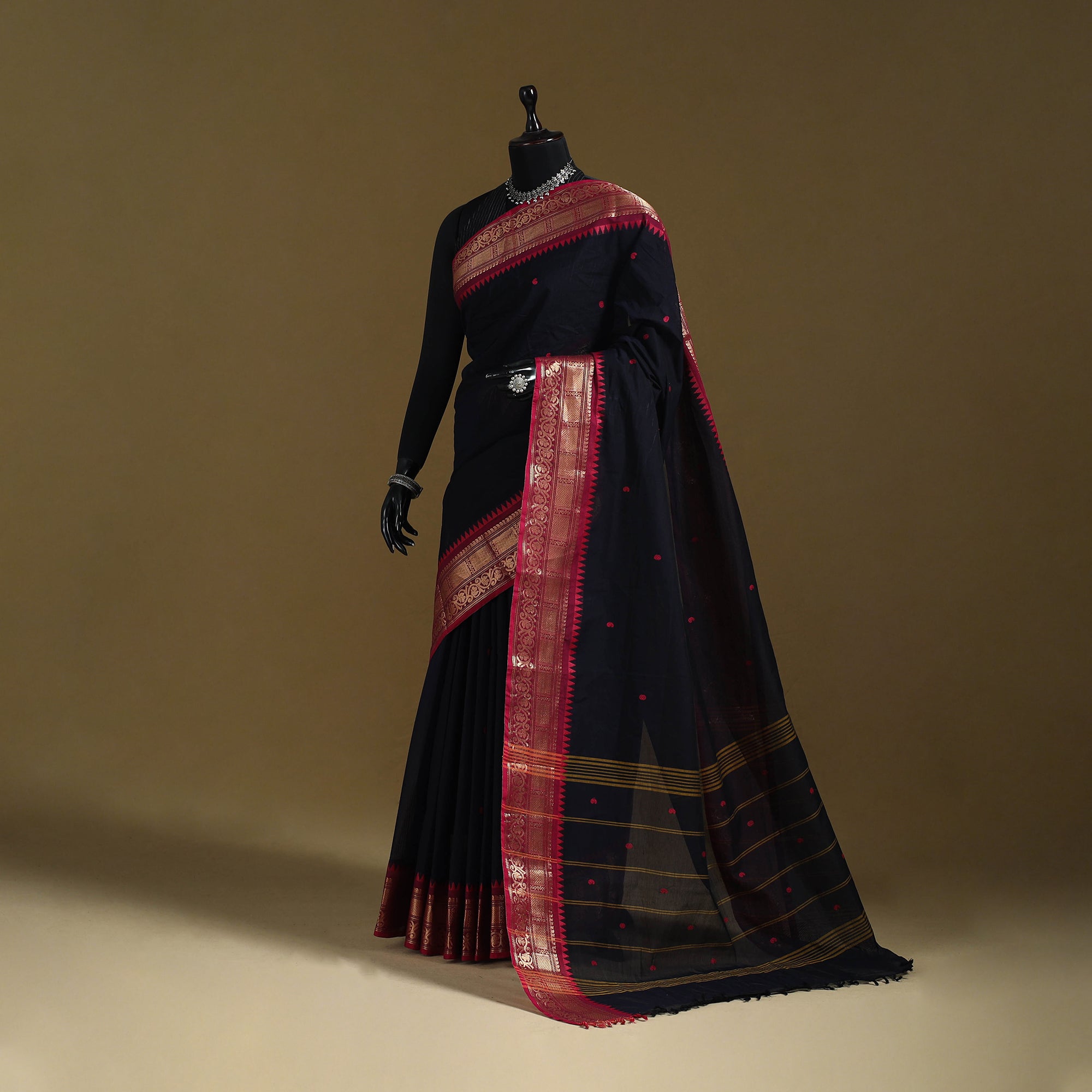 | Material | Black kanchipuram cotton saree from Tamil Nadu, a city widely known as the Temple City of India. Also called a Kanjeevaram saree, it features thread buti designs on the body and is especially known for its woven border work, which adds a refined touch to the overall look. Comfortable and easy to carry, it works well for regular wear, workdays, special occasions and wedding functions. Note: This piece carries tiny knots, thread pulls or uneven lines not flaws but fingerprints. Every irregularity is a whisper from the hands that made it. It’s what happens when tradition weaves through time not machines. If you’re looking for perfection, this isn’t it. But if you’re looking for soul you’ve found it. |