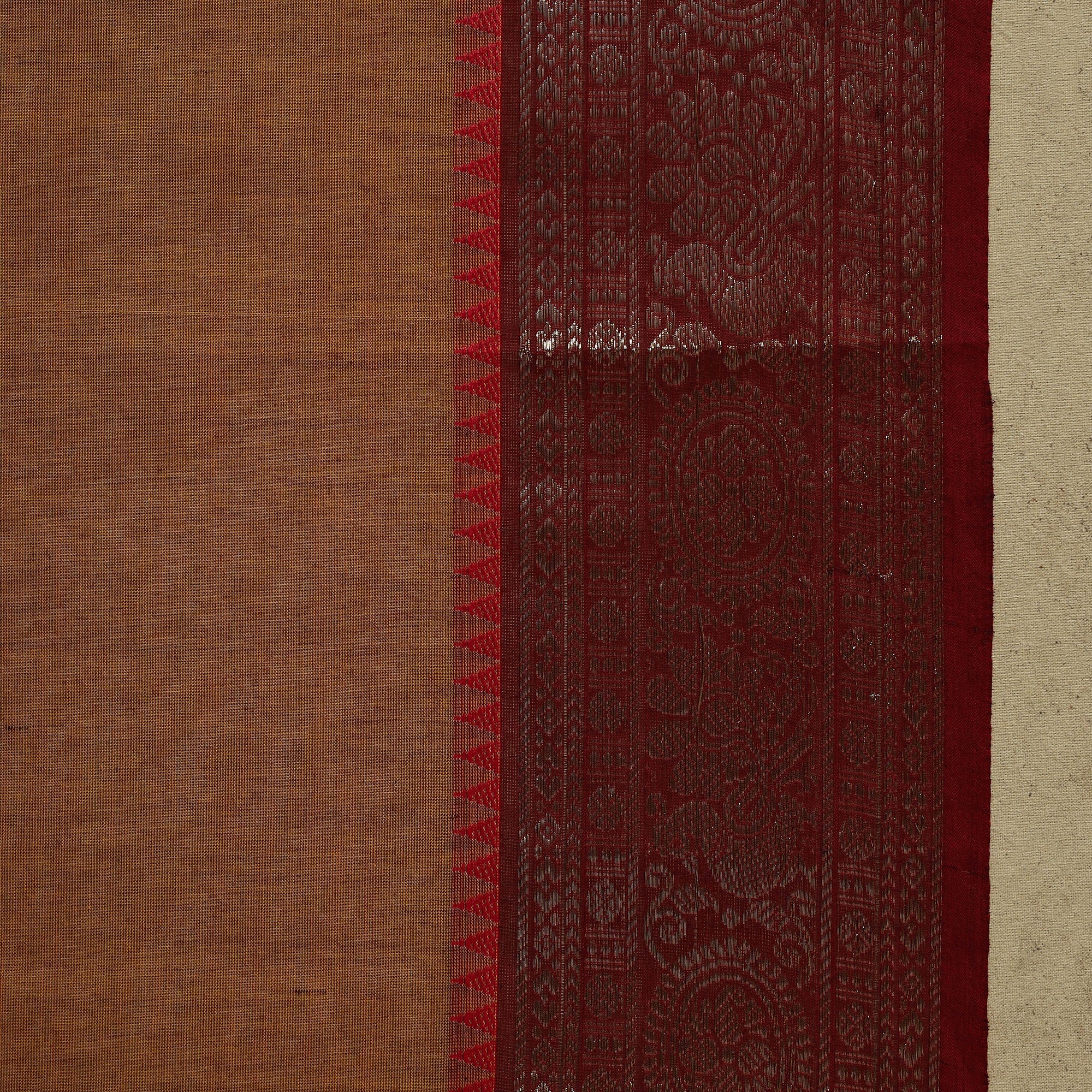 Brown kanchipuram cotton saree from Tamil Nadu, a city widely known as the Temple City of India. Also called a Kanjeevaram saree, it features thread buti designs on the body and is especially known for its woven border work, which adds a refined touch to the overall look. Comfortable and easy to carry, it works well for regular wear, workdays, special occasions and wedding functions.