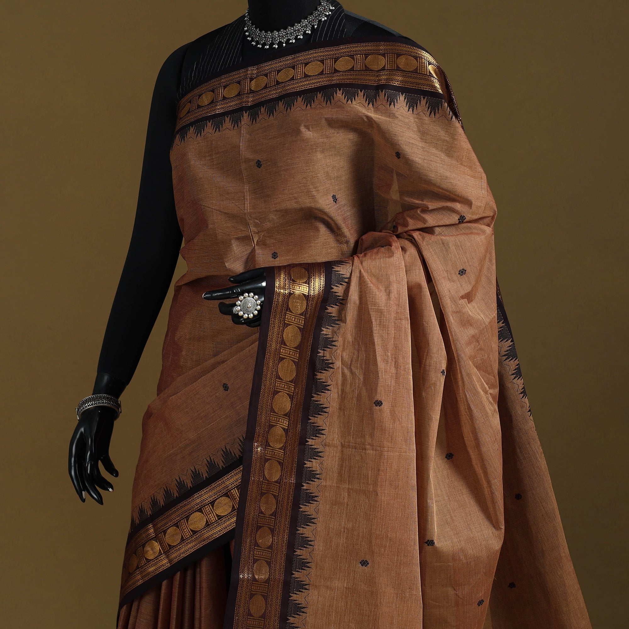 | Material | Brown kanchipuram cotton saree from Tamil Nadu, a city widely known as the Temple City of India. Also called a Kanjeevaram saree, it features thread buti designs on the body and is especially known for its woven border work, which adds a refined touch to the overall look. Comfortable and easy to carry, it works well for regular wear, workdays, special occasions and wedding functions. Note: This piece carries tiny knots, thread pulls or uneven lines not flaws but fingerprints. Every irregularity is a whisper from the hands that made it. It’s what happens when tradition weaves through time not machines. If you’re looking for perfection, this isn’t it. But if you’re looking for soul you’ve found it. |
