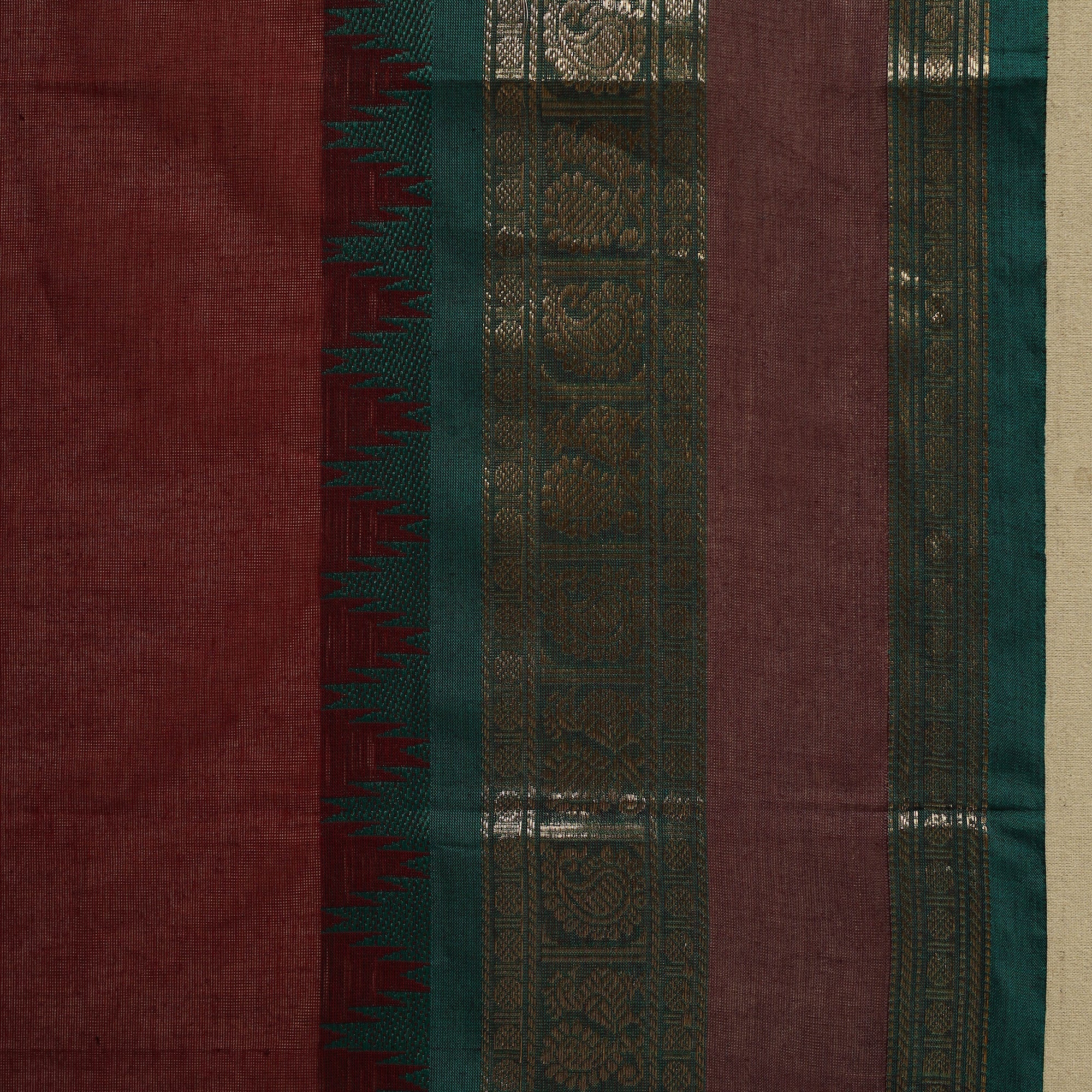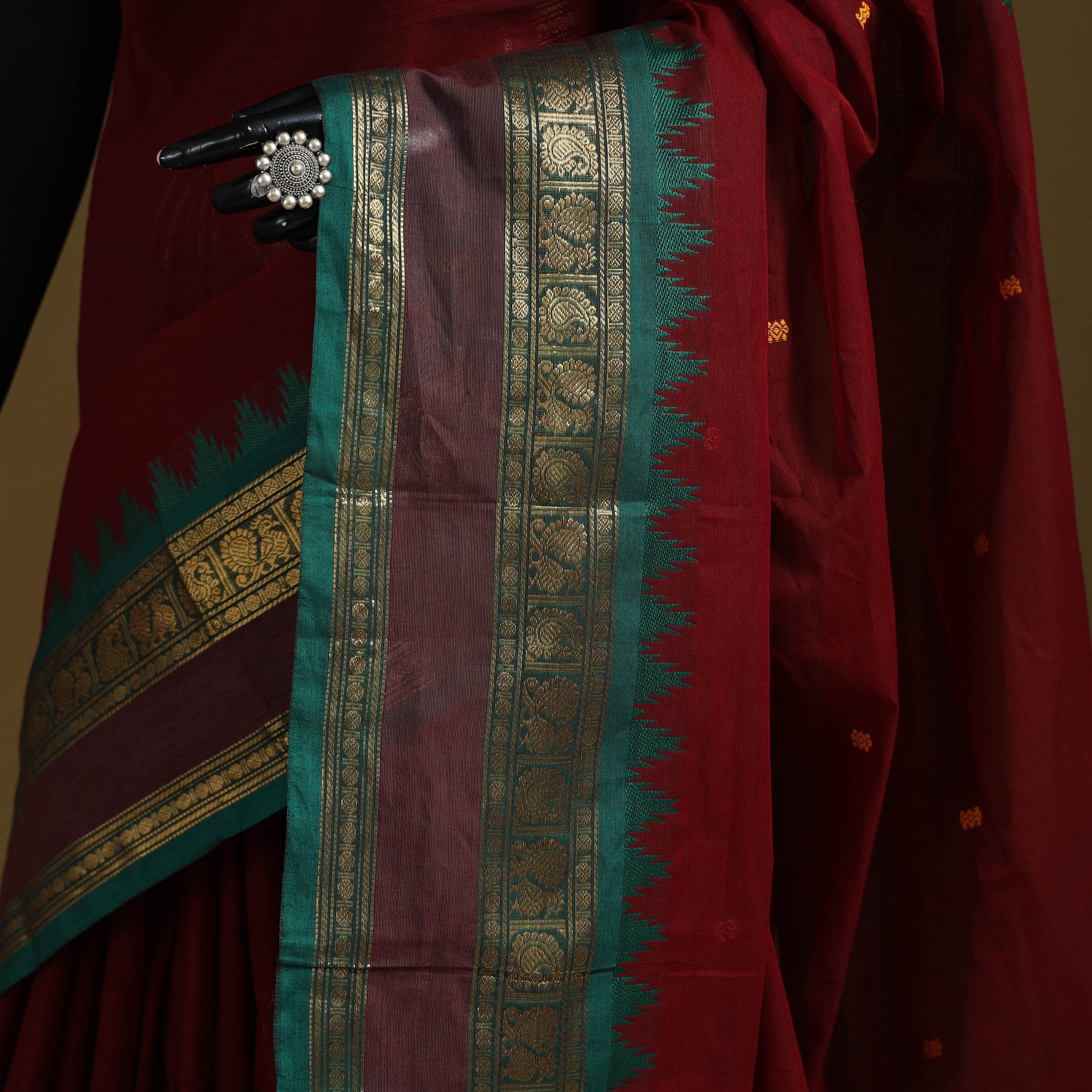 | Material | Maroon kanchipuram cotton saree from Tamil Nadu, a city widely known as the Temple City of India. Also called a Kanjeevaram saree, it features thread buti designs on the body and is especially known for its woven border work, which adds a refined touch to the overall look. Comfortable and easy to carry, it works well for regular wear, workdays, special occasions and wedding functions. Note: This piece carries tiny knots, thread pulls or uneven lines not flaws but fingerprints. Every irregularity is a whisper from the hands that made it. It’s what happens when tradition weaves through time not machines. If you’re looking for perfection, this isn’t it. But if you’re looking for soul you’ve found it. |