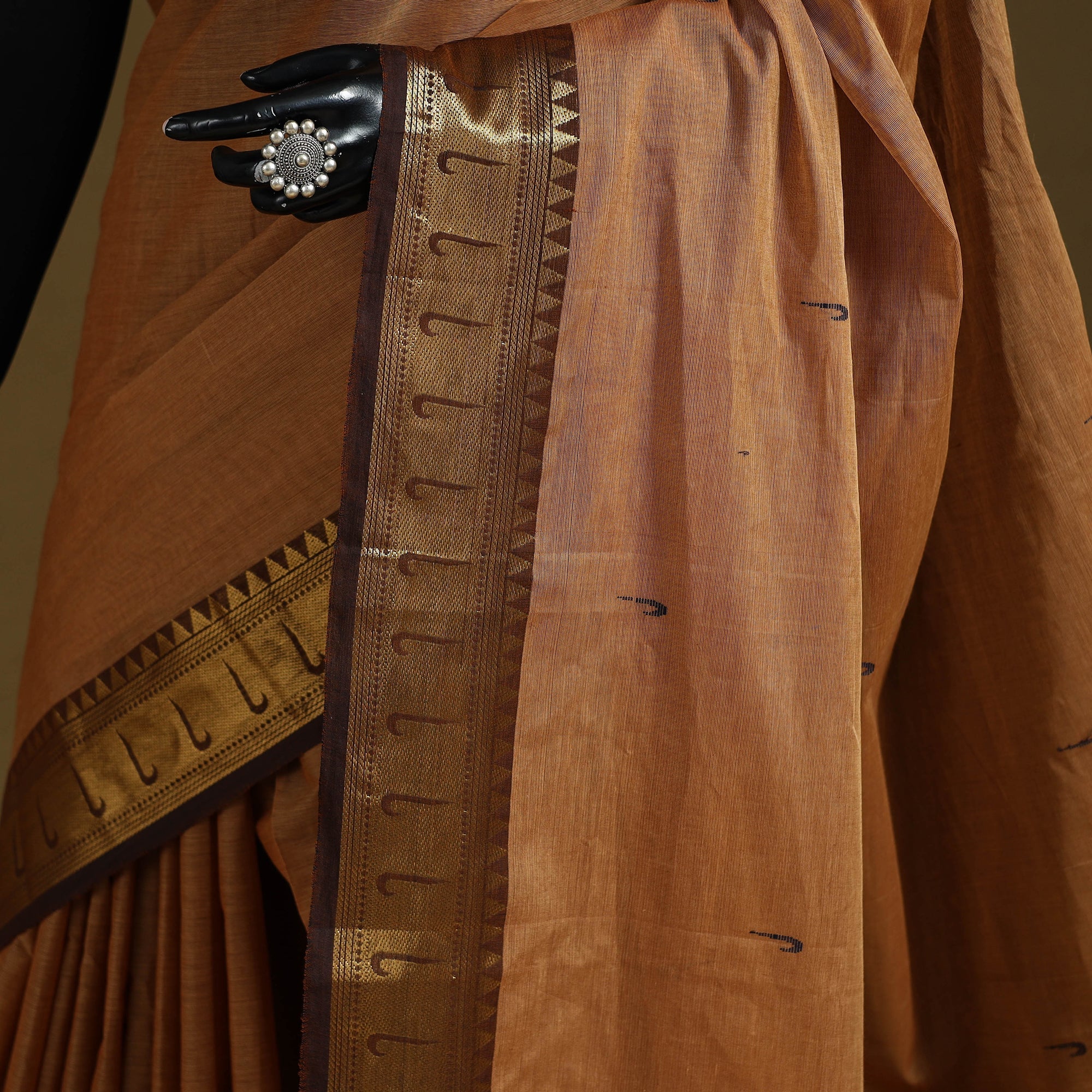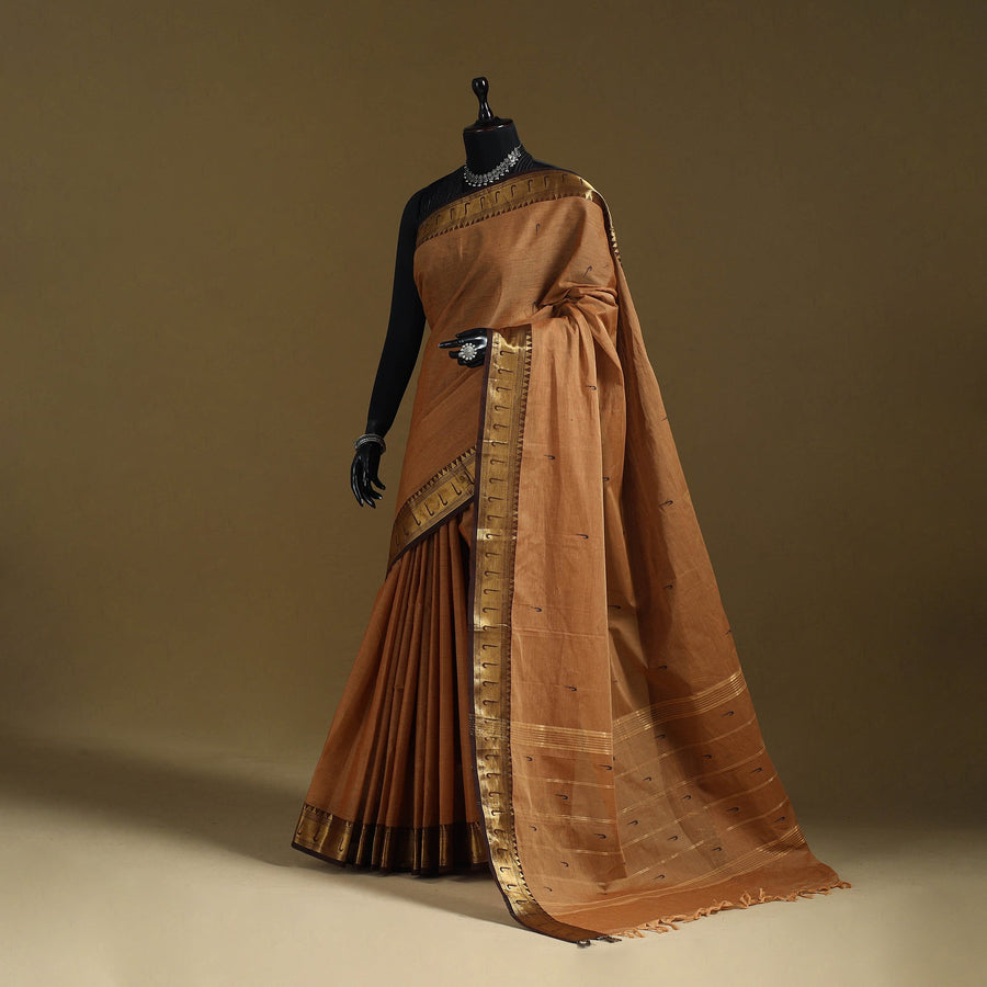 Brown kanchipuram cotton saree from Tamil Nadu, a city widely known as the Temple City of India. Also called a Kanjeevaram saree, it features thread buti designs on the body and is especially known for its woven border work, which adds a refined touch to the overall look. Comfortable and easy to carry, it works well for regular wear, workdays, special occasions and wedding functions.