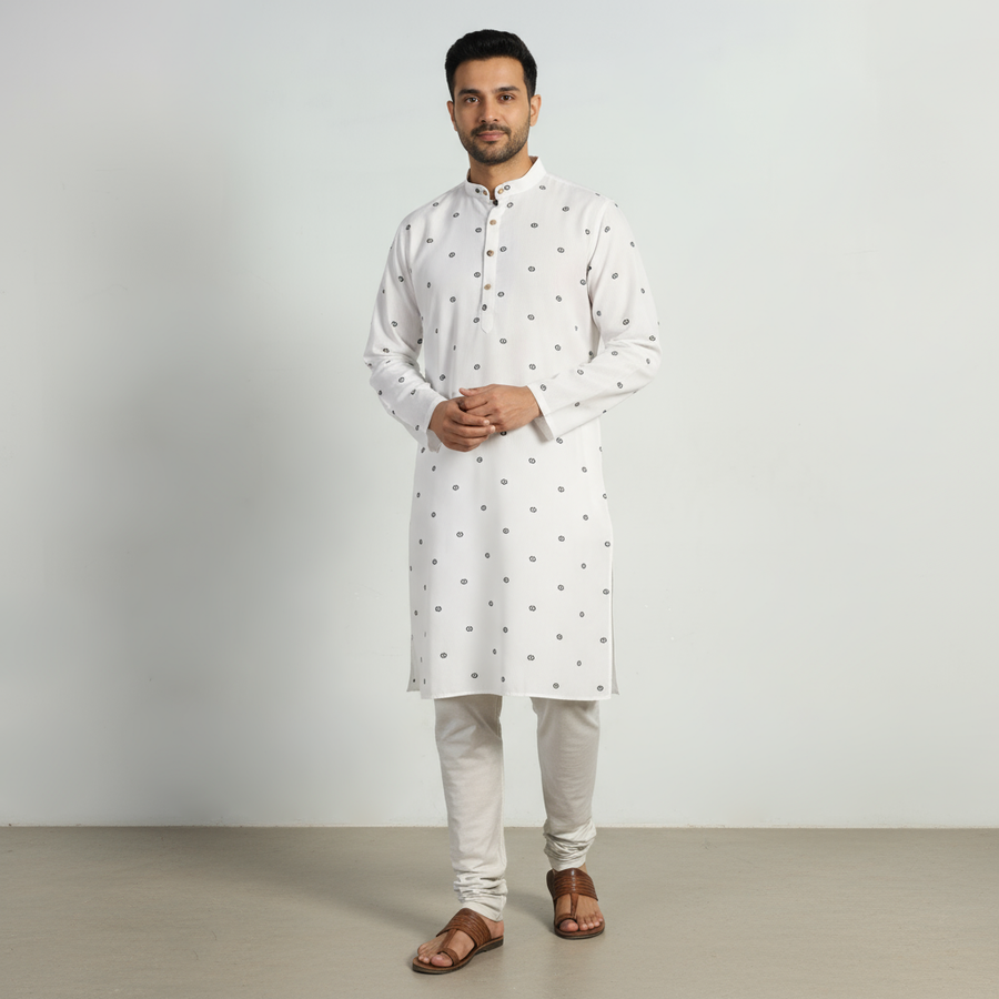Enhance your everyday style with our white thread buti long plain kurta for men. Crafted from soft cotton fabric this kurta offers both comfort and elegance. Featuring full sleeves, a chinese collar, front button placket and two side pockets, it’s perfect for daily wear or special occasions.