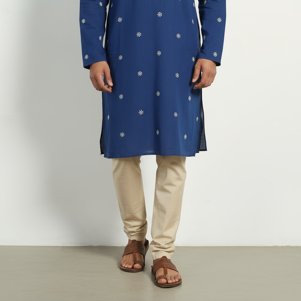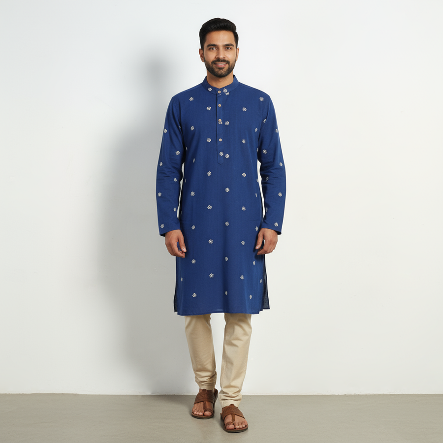 Enhance your everyday style with our blue thread buti long plain kurta for men. Crafted from soft cotton fabric this kurta offers both comfort and elegance. Featuring full sleeves, a chinese collar, front button placket and two side pockets, it’s perfect for daily wear or special occasions.