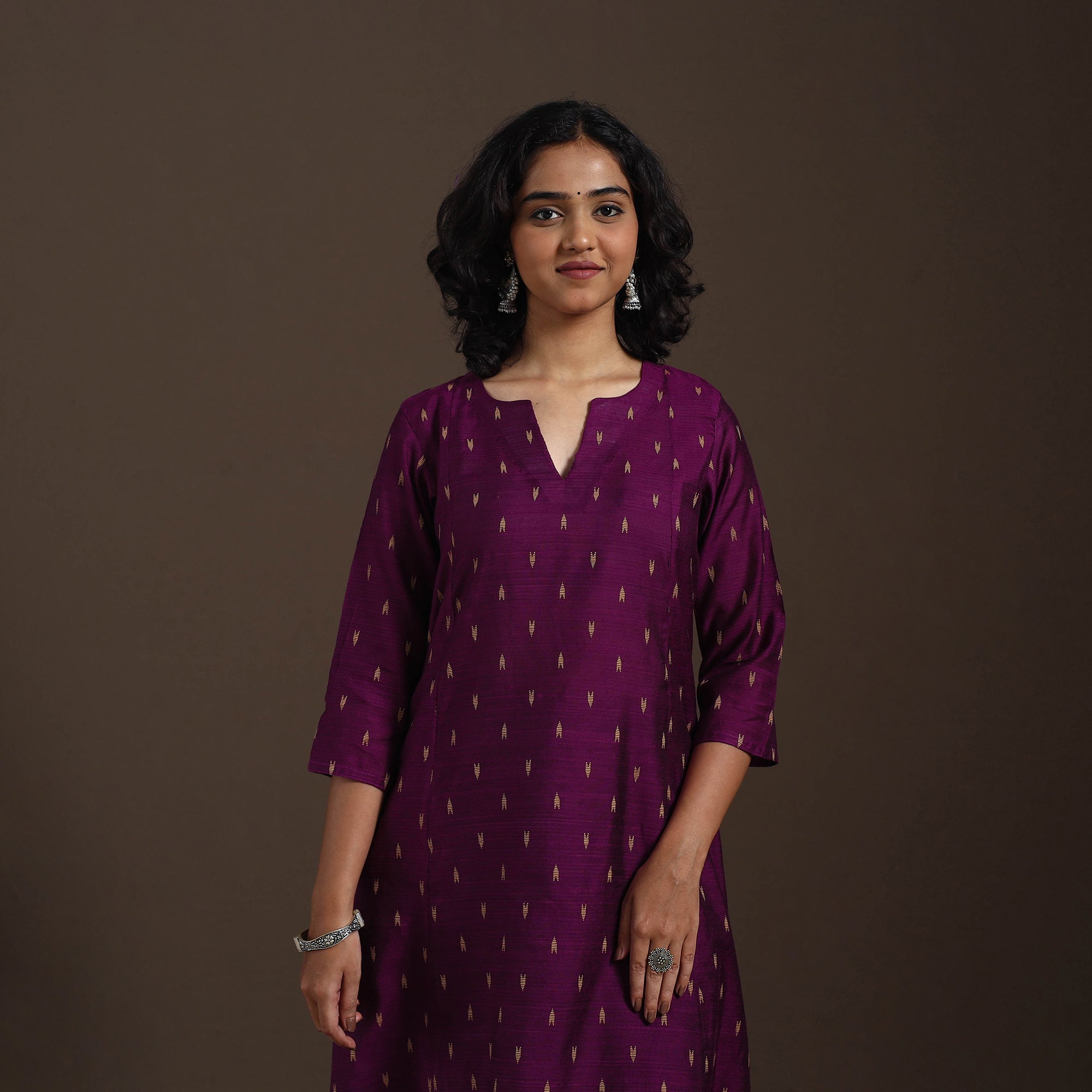This uniquely designed purple thread buti dupion silk A-line kurta set brings together effortless elegance and everyday comfort. Crafted from a premium viscose-polyester blend, the kurta features a single side pocket, while the matching plain slub silk palazzo includes two functional side pockets for added ease. Soft, breathable, and chic, this kurta set is perfect for daily wear as well as festive occasions.