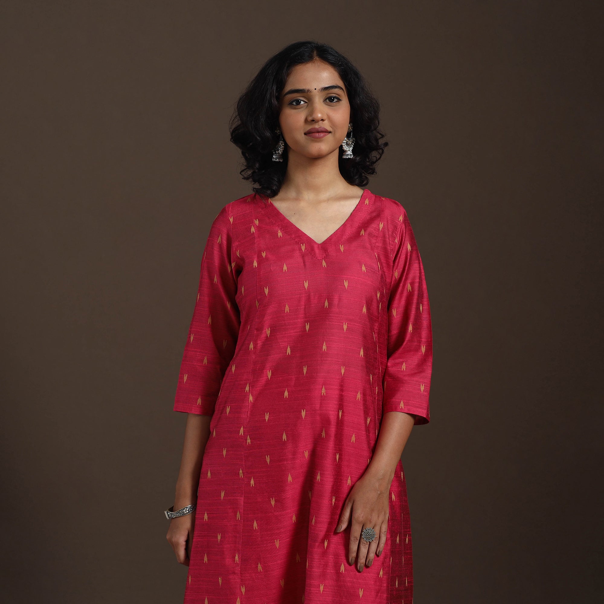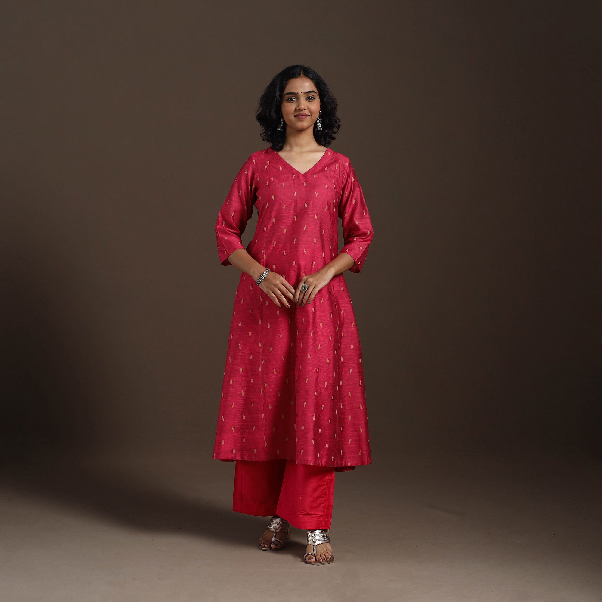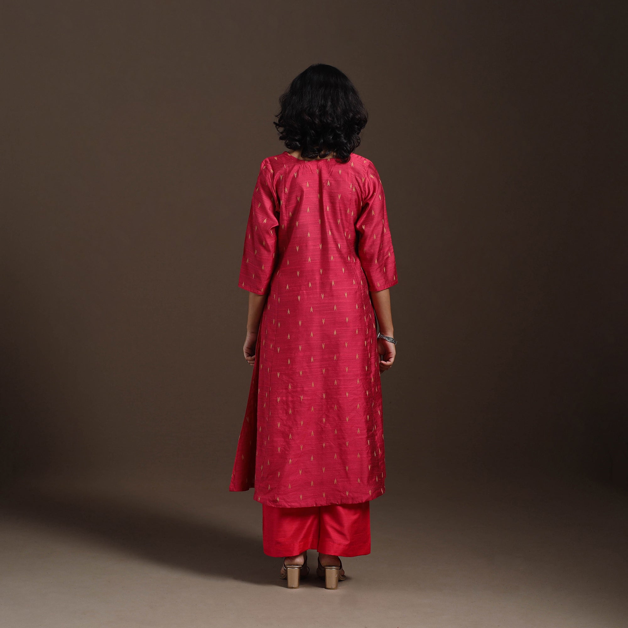 This uniquely designed red thread buti dupion silk A-line kurta set brings together effortless elegance and everyday comfort. Crafted from a premium viscose-polyester blend, the kurta features a single side pocket, while the matching plain slub silk palazzo includes two functional side pockets for added ease. Soft, breathable, and chic, this kurta set is perfect for daily wear as well as festive occasions.