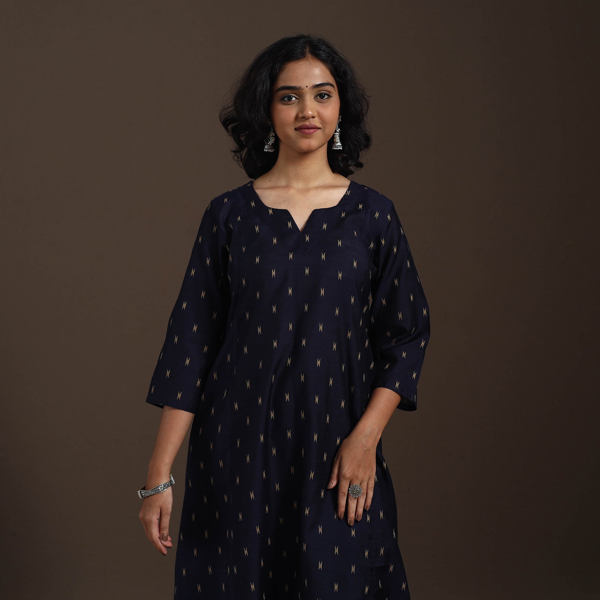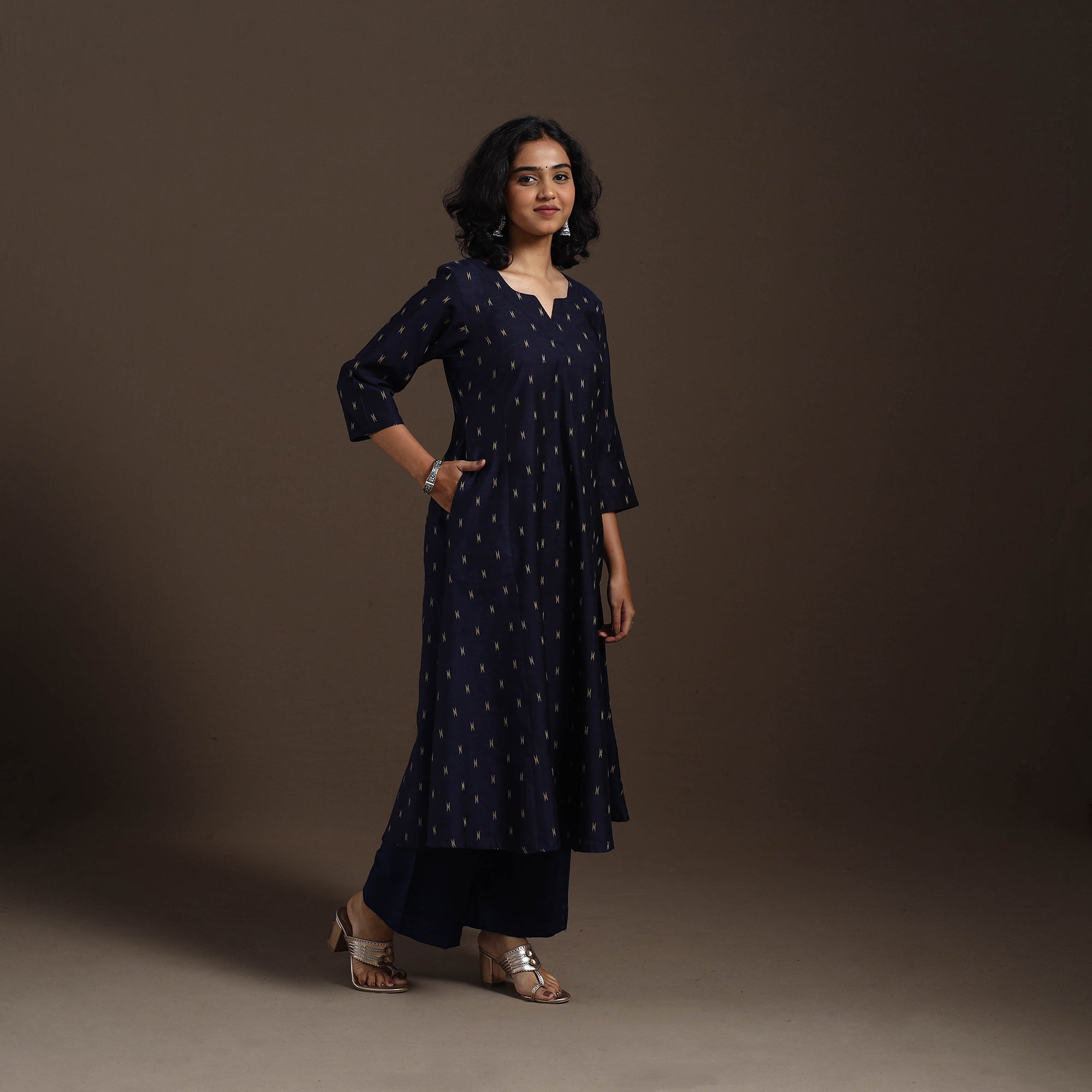 This uniquely designed blue thread buti dupion silk A-line kurta set brings together effortless elegance and everyday comfort. Crafted from a premium viscose-polyester blend, the kurta features a single side pocket, while the matching plain slub silk palazzo includes two functional side pockets for added ease. Soft, breathable, and chic, this kurta set is perfect for daily wear as well as festive occasions.