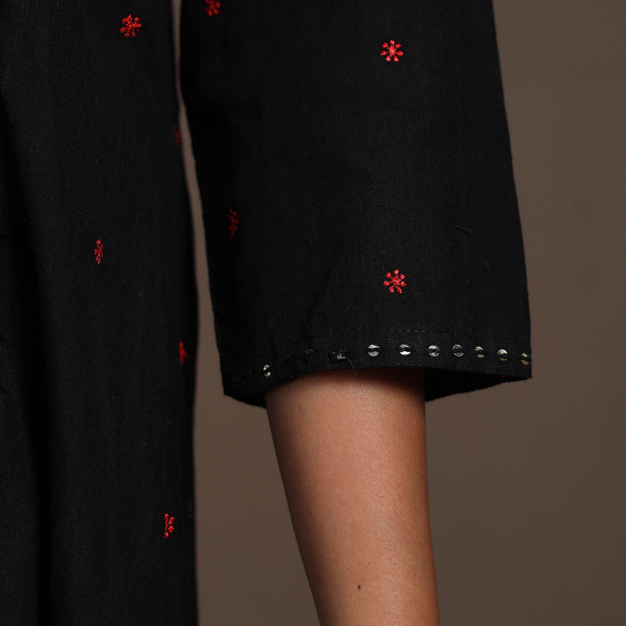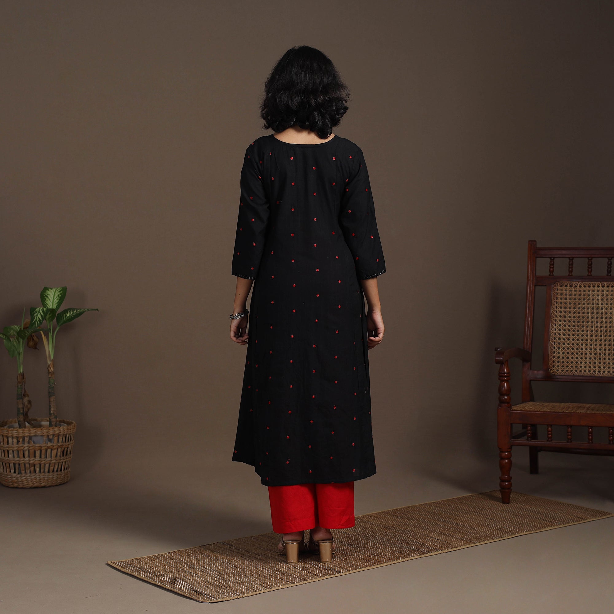 Experience effortless elegance with this black thread buti A-line kurta set, made from soft, breathable cotton for all-day ease. The kurta includes a convenient single side pocket and pairs with plain cotton palazzos featuring dual pockets for functionality. Ideal for daily wear or festive moments, this set blends subtle grace with comfort to your new wardrobe favourite.