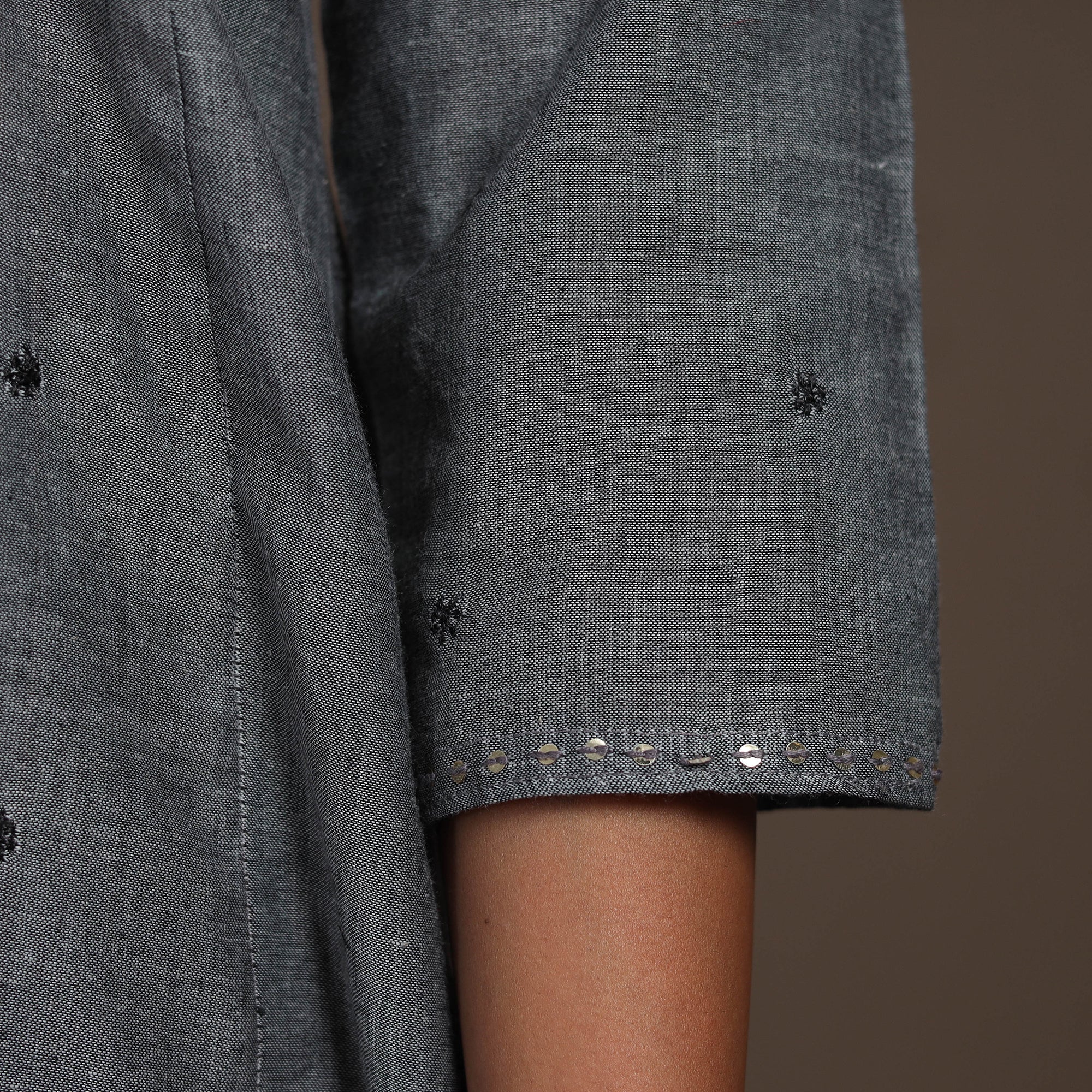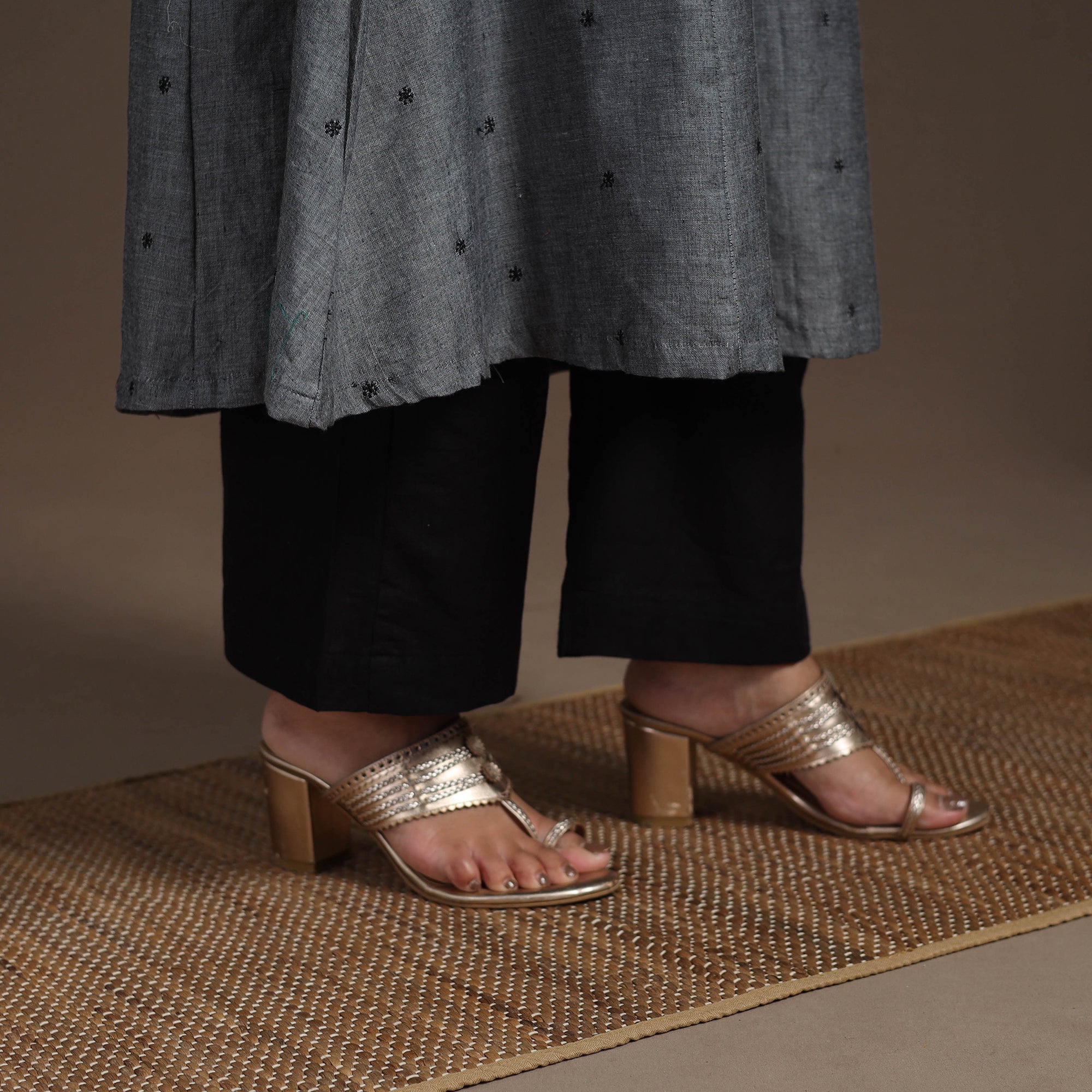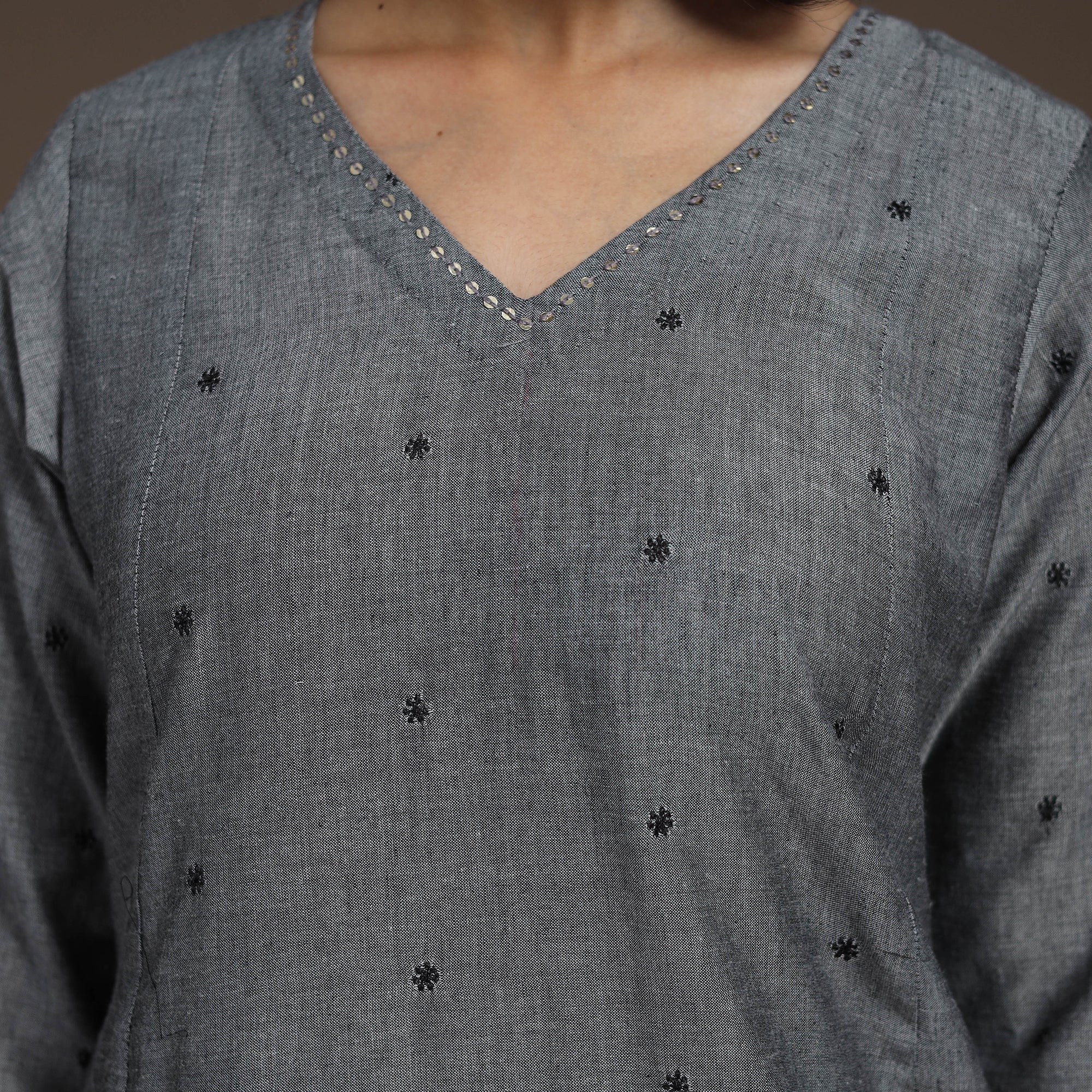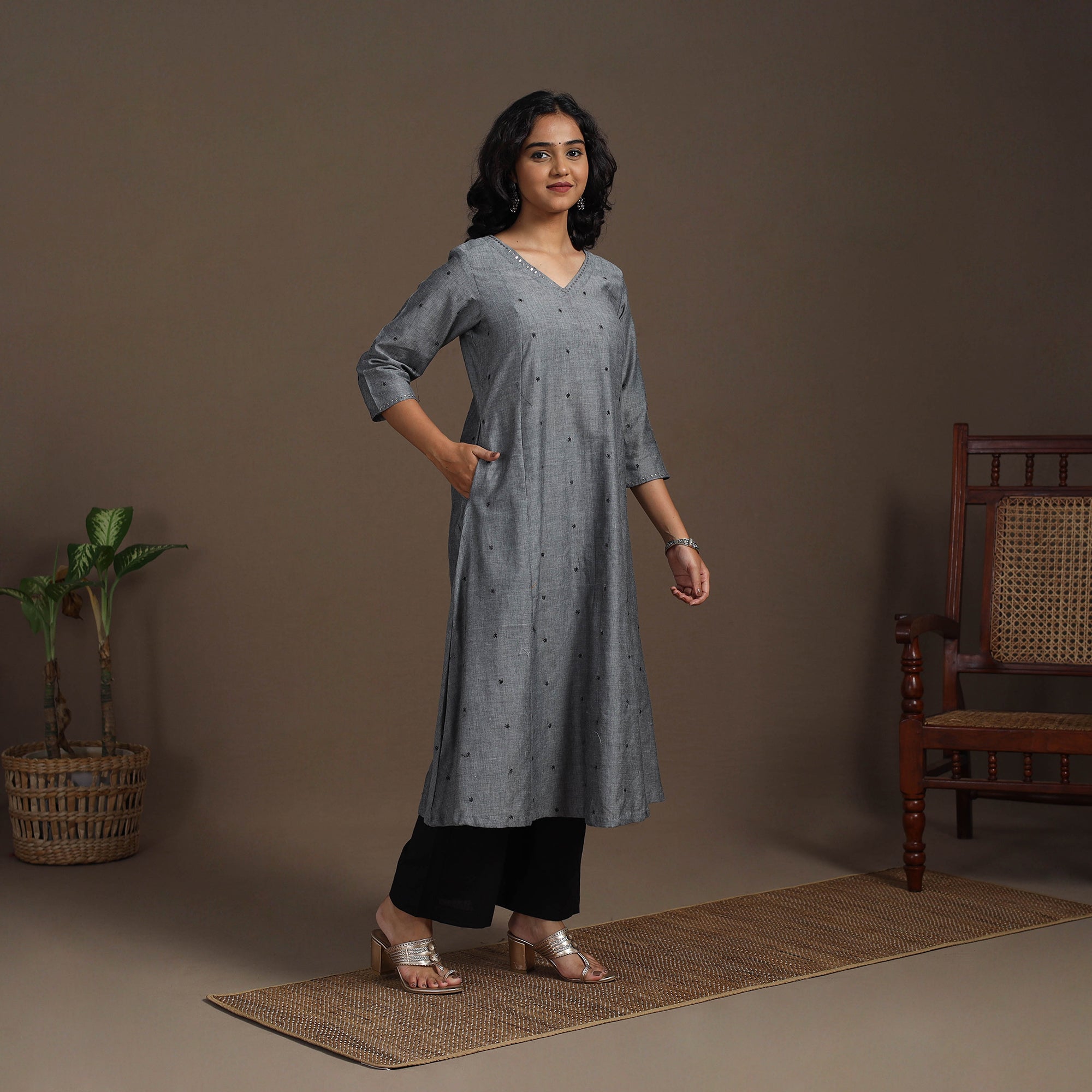 Experience effortless elegance with this grey thread buti A-line kurta set, made from soft, breathable cotton for all-day ease. The kurta includes a convenient single side pocket and pairs with plain cotton palazzos featuring dual pockets for functionality. Ideal for daily wear or festive moments, this set blends subtle grace with comfort to your new wardrobe favourite.
