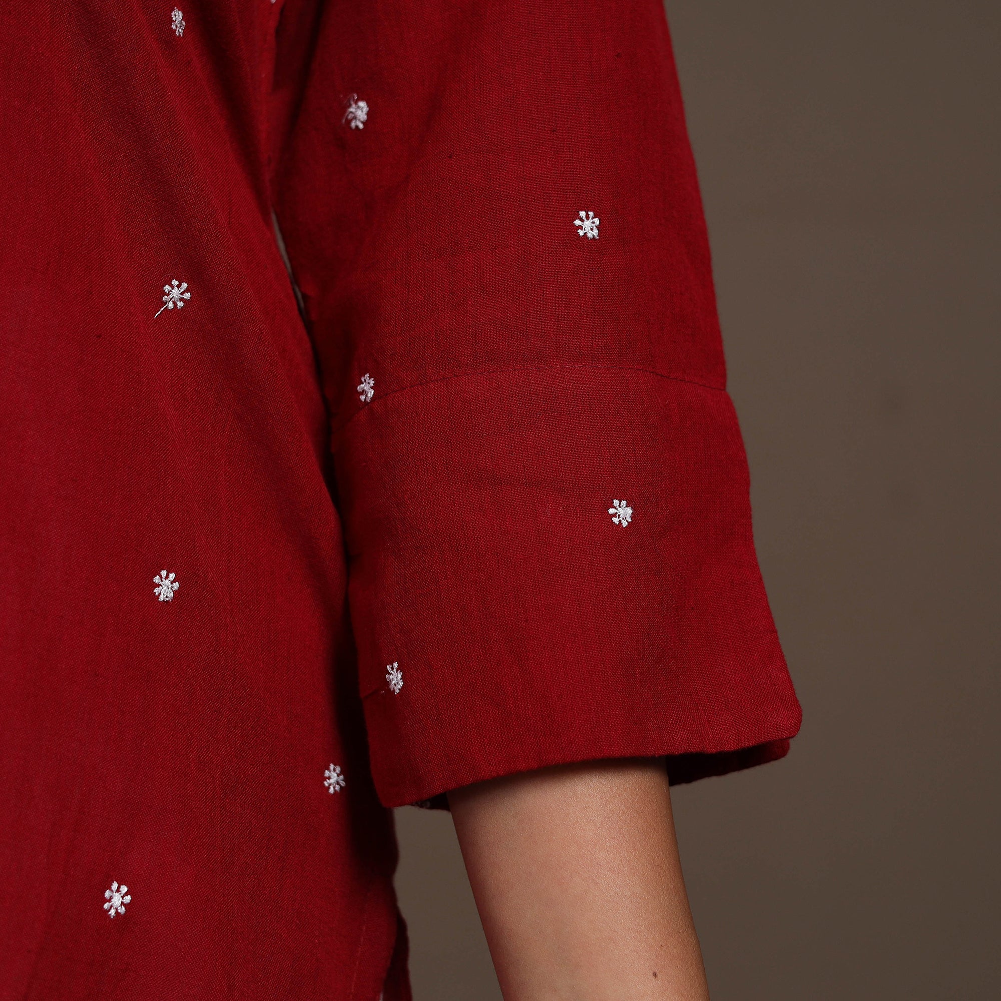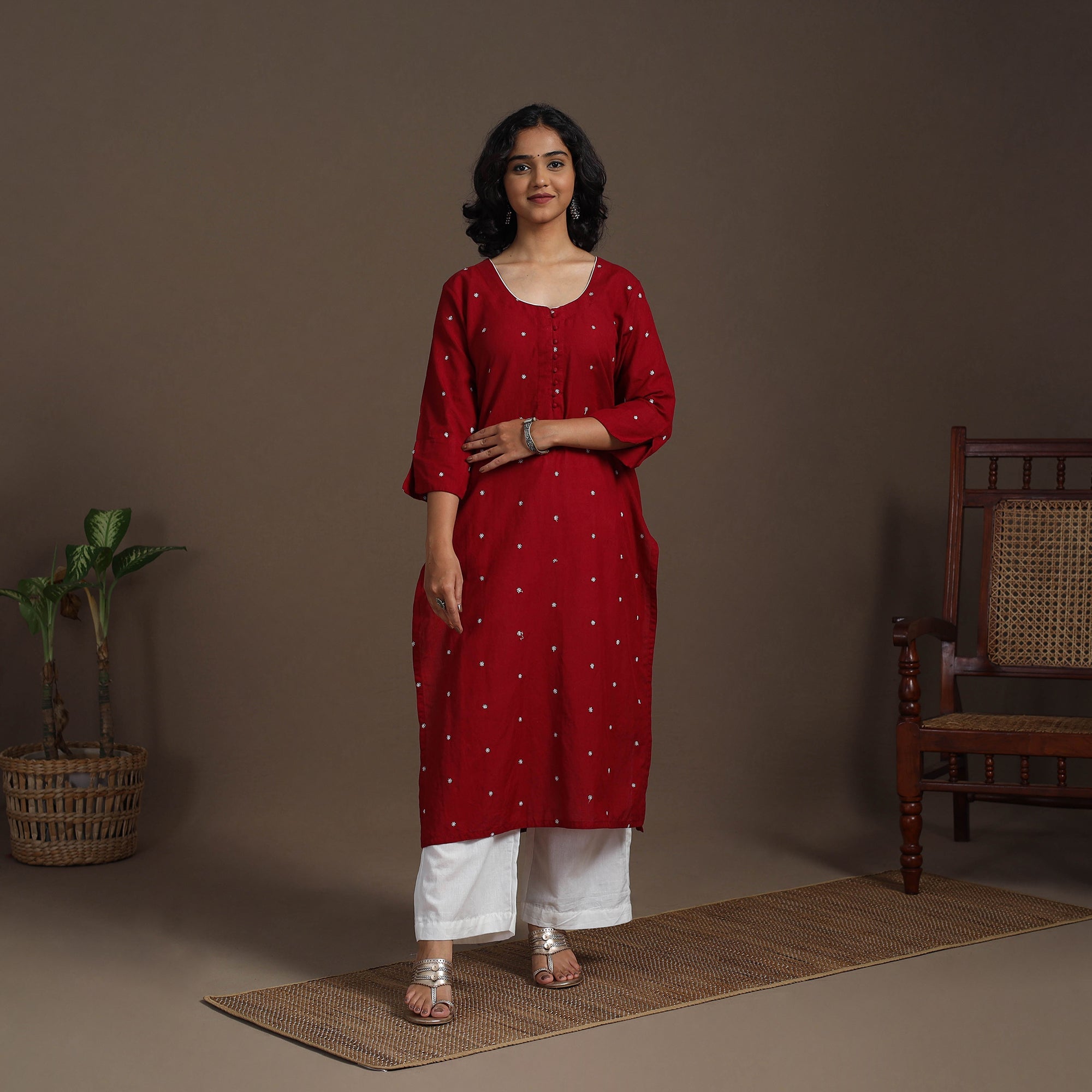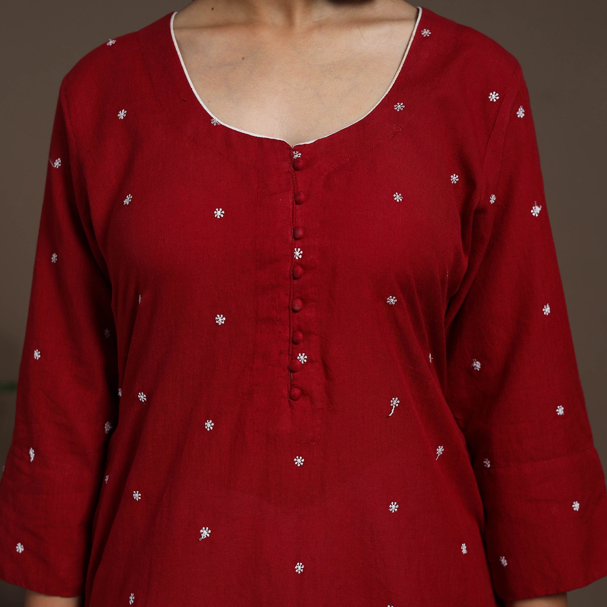 Experience easy elegance with this maroon thread buti work straight kurta set, crafted from soft, breathable cotton for all-day comfort. The kurta comes with a handy single-side pocket, paired with plain cotton palazzo featuring two pockets for practicality. Perfect for everyday wear or festive gatherings, this set blends simplicity with charm, making it a versatile wardrobe favourite.