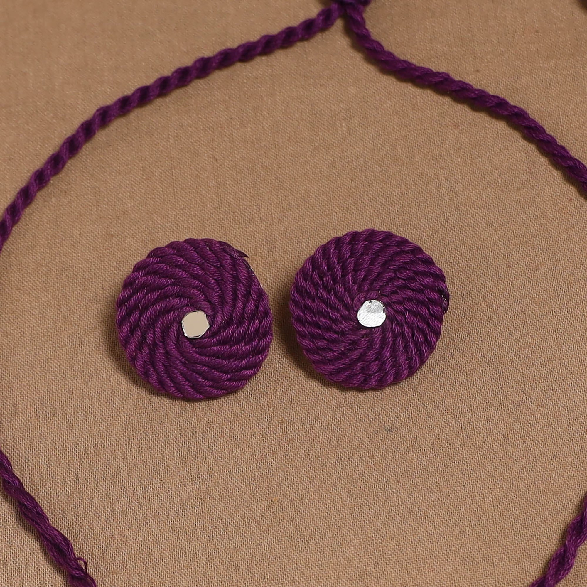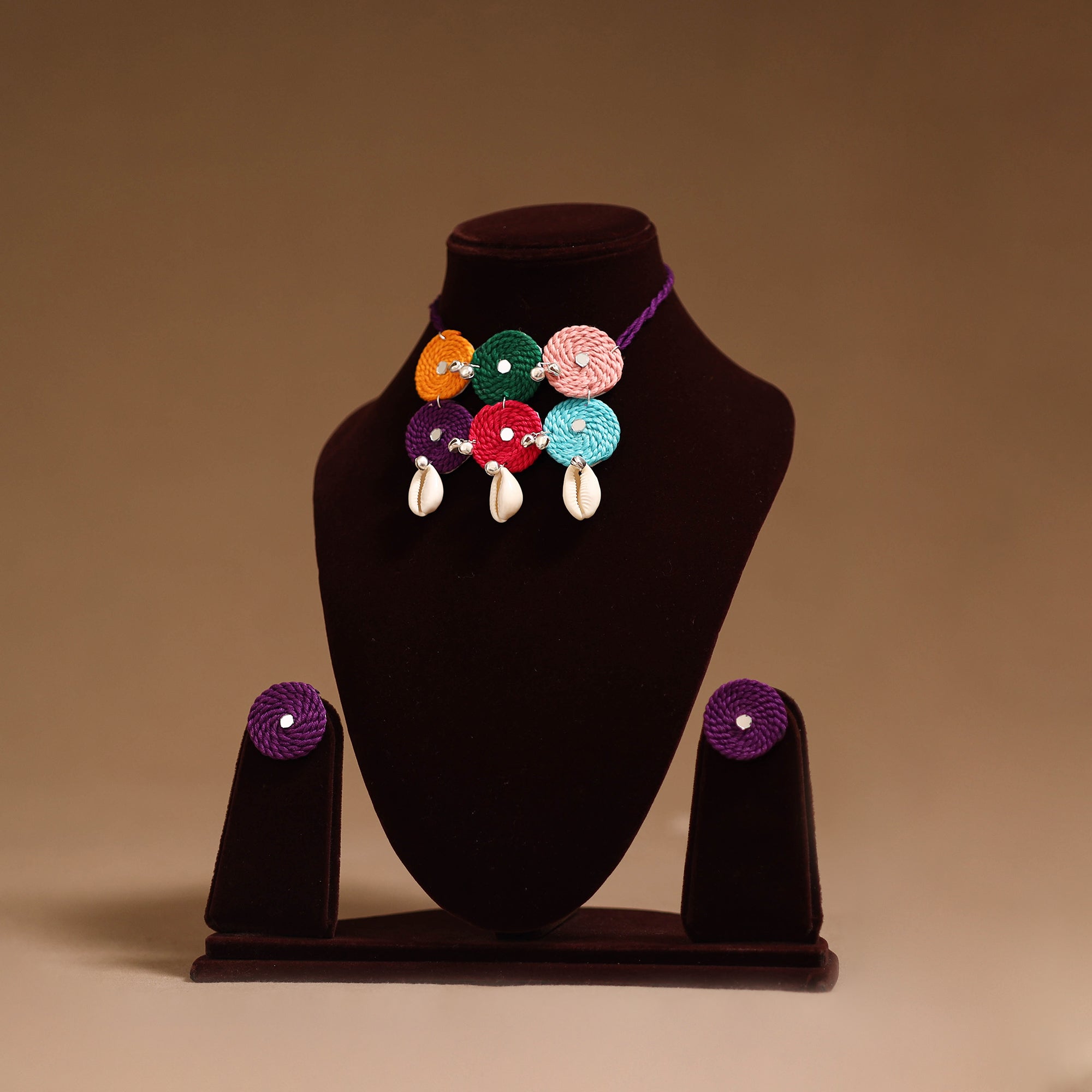 Handmade necklace set featuring thread, ghungroo, mirror and shell work. It comes with matching earrings for a complete look. Created by artisans, this set is suitable for weddings, cultural functions or for adding a unique flair to everyday style.