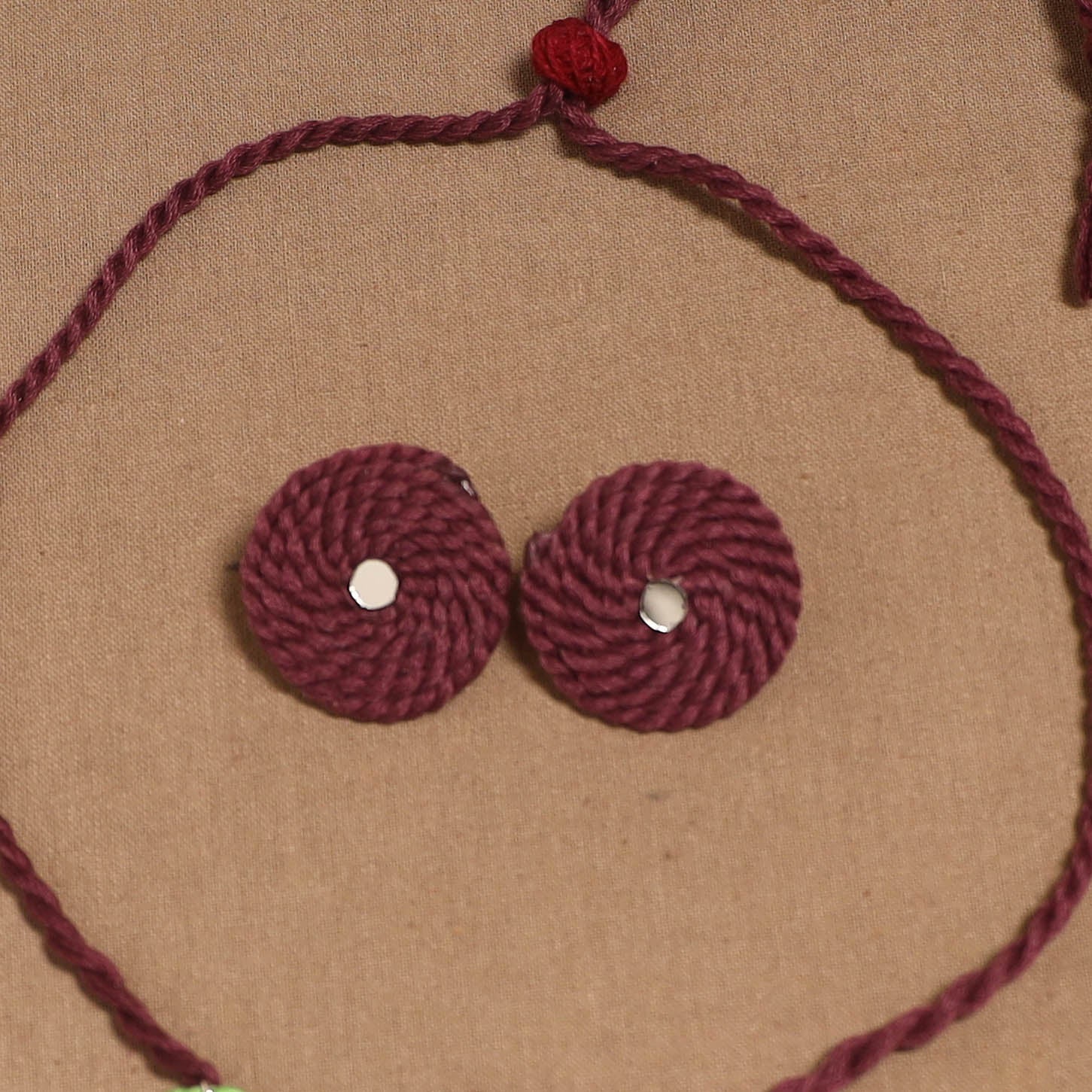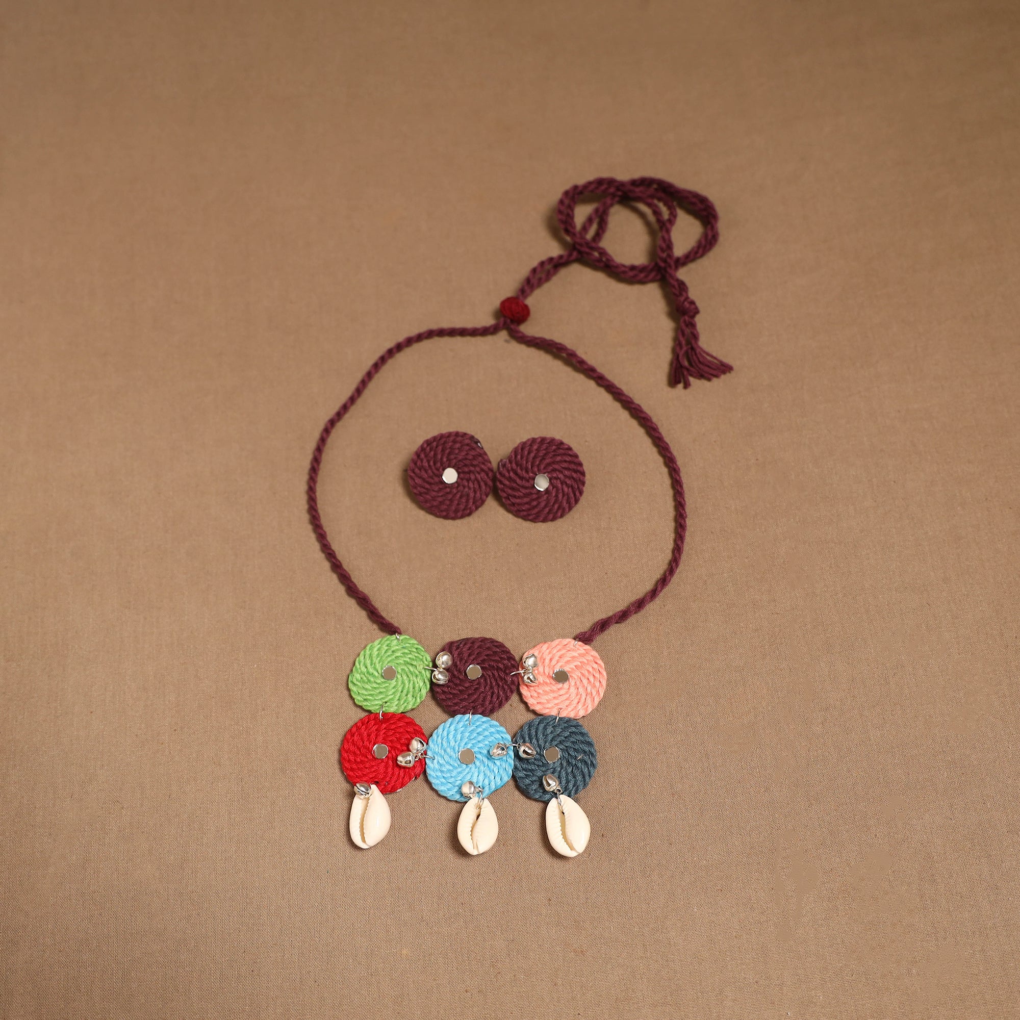 Handmade necklace set featuring thread, ghungroo, mirror and shell work. It comes with matching earrings for a complete look. Created by artisans, this set is suitable for weddings, cultural functions or for adding a unique flair to everyday style.