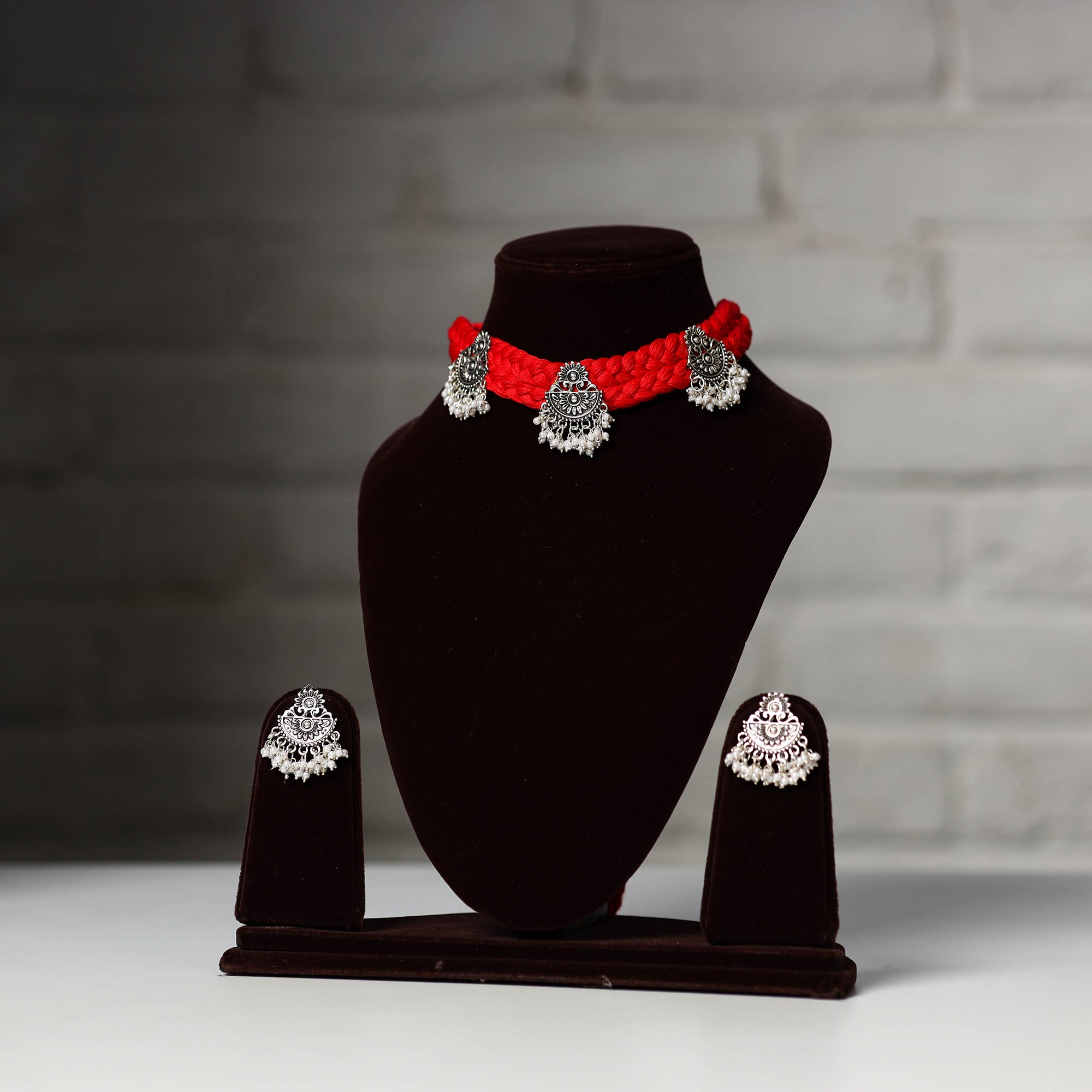 Enhance your style with this red thread work german silver necklace set, featuring intricate thread detailing and matching earrings. Lightweight and versatile, it’s perfect for pairing with ethnic or modern outfits. Ideal for everyday wear or special occasions, this set adds a subtle yet striking finish to your look. German silver jewelry has gained popularity due to its affordability, durability, and resemblance to silver. It's often used as a more economical alternative to sterling silver.
