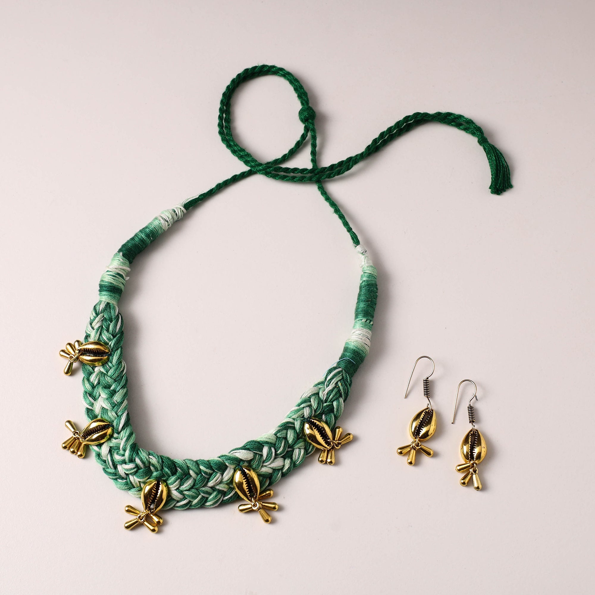 Enhance your style with this green thread work german silver necklace set, featuring intricate thread detailing and matching earrings. Lightweight and versatile, it’s perfect for pairing with ethnic or modern outfits. Ideal for everyday wear or special occasions, this set adds a subtle yet striking finish to your look. German silver jewelry has gained popularity due to its affordability, durability, and resemblance to silver. It's often used as a more economical alternative to sterling silver.