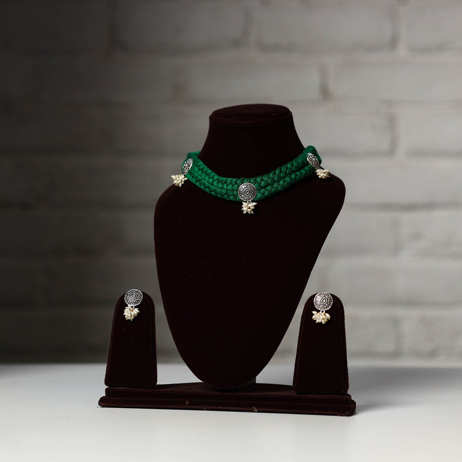 Enhance your style with this green thread work german silver necklace set, featuring intricate thread detailing and matching earrings. Lightweight and versatile, it’s perfect for pairing with ethnic or modern outfits. Ideal for everyday wear or special occasions, this set adds a subtle yet striking finish to your look. German silver jewelry has gained popularity due to its affordability, durability, and resemblance to silver. It's often used as a more economical alternative to sterling silver.