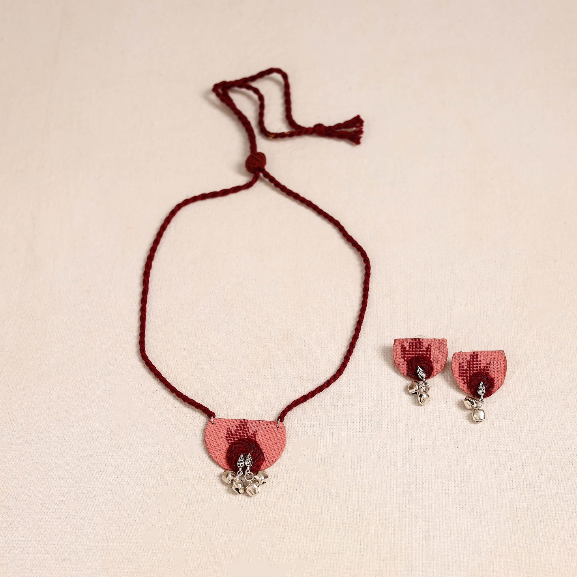 Elevate your style with our pink handcrafted necklace set. Intricately designed with fabric, german silver, and fine thread work, this set exudes sophistication. Stylish and graceful, it enhances any outfit with a perfect blend of tradition and contemporary flair. Paired with matching earrings for a complete, coordinated look.