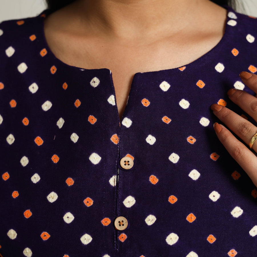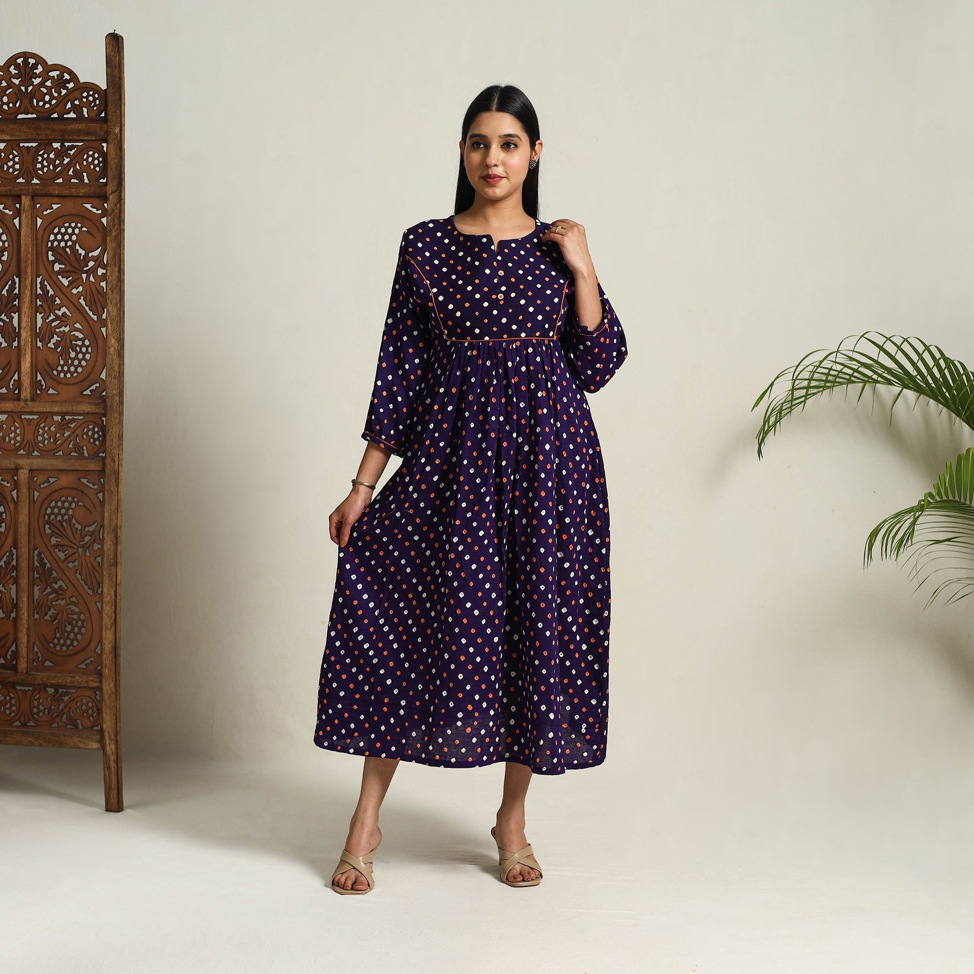 This exquisite blue tie & dye cotton flared bandhani dress is beautifully blends style and comfort. This dress is crafted from soft cotton fabric. The dress also features a convenient one-side pocket, perfect for carrying small essentials. The flared design adds a graceful touch, making it perfect for casual outings or festive occasions.