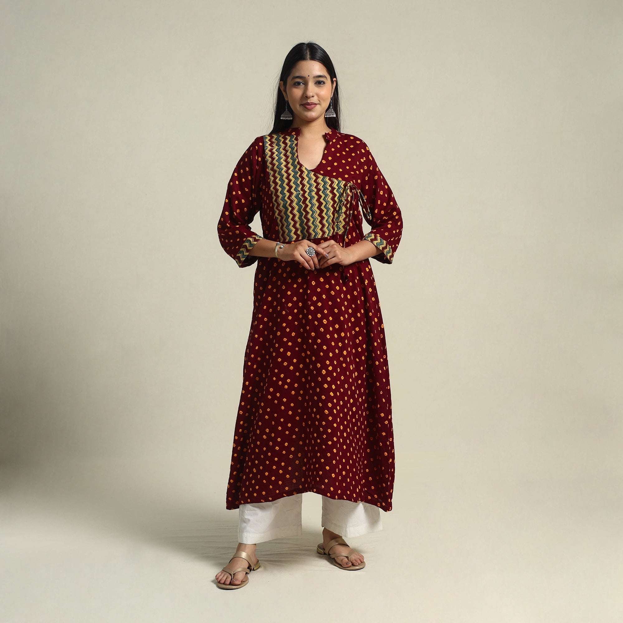 Adorn yourself in the timeless elegance of this maroon tie-dye cotton patchwork A-line bandhani kurta. This kurta features vibrant patterns that reflect the region’s rich textile heritage. The fabric is soft and breathable, ensuring all day comfort. With a side pocket for practicality, this kurta is perfect for both casual outings and festive occasions.
