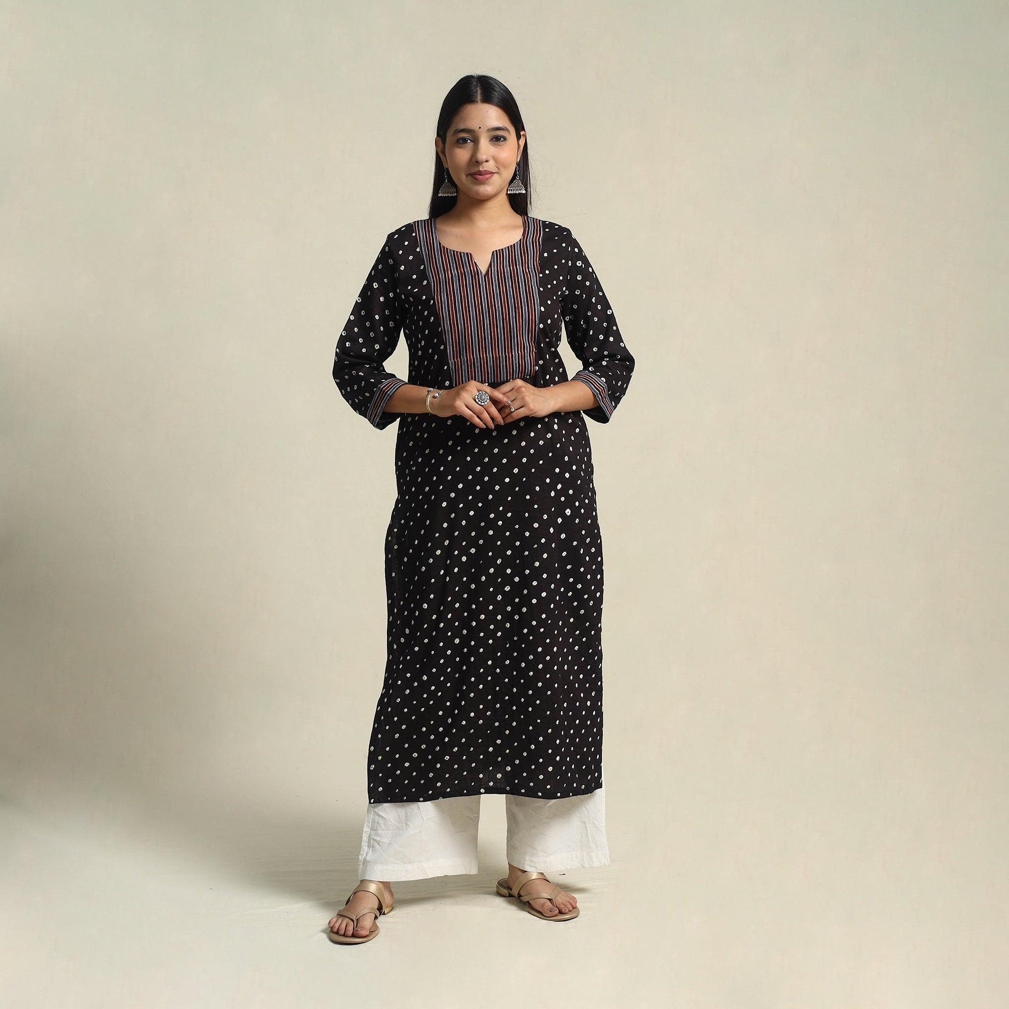 Step into effortless style with this black tie-dye cotton patchwork bandhani kurta. Designed with vibrant motifs inspired by rich traditions, it offers a soft, breathable fabric for all day ease. A handy side pocket adds functionality, making it ideal for casual days or festive gatherings.