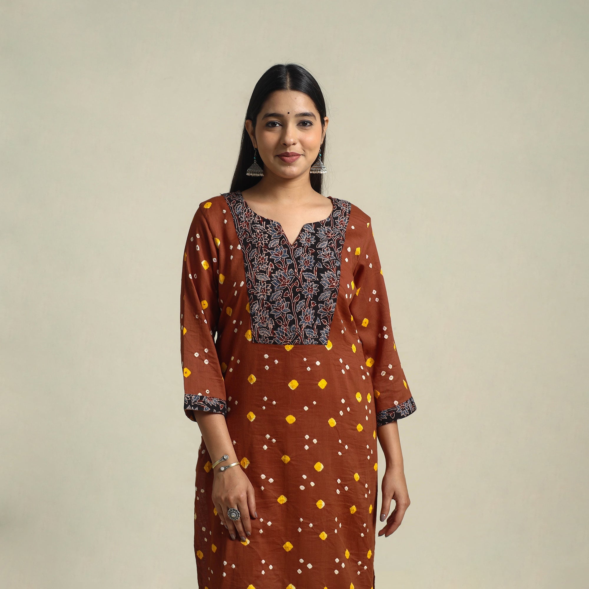 Step into effortless style with this brown tie-dye cotton patchwork bandhani kurta. Designed with vibrant motifs inspired by rich traditions, it offers a soft, breathable fabric for all day ease. A handy side pocket adds functionality, making it ideal for casual days or festive gatherings.