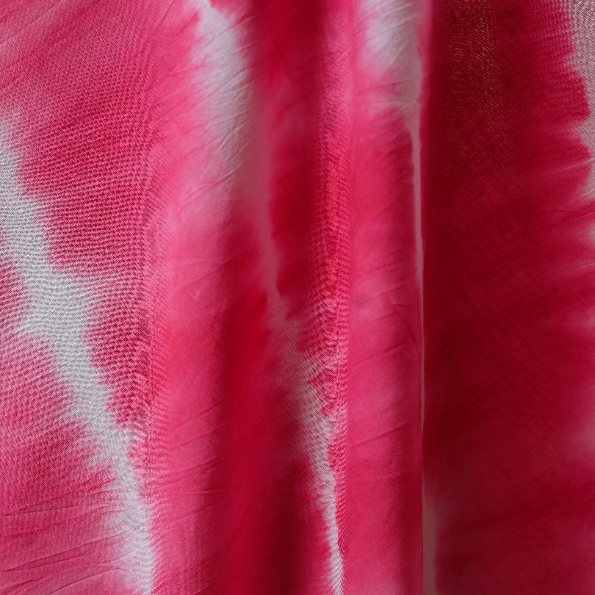 Pink pure cotton shibori fabric is made using the traditional tie-dye method, where parts of the cloth are tied or clamped before dyeing to create beautiful patterns. Each piece is slightly different, showing the charm of handmade work. The soft and breathable cotton makes it great for making kurtas, dresses, dupattas, or even unique home decor items.